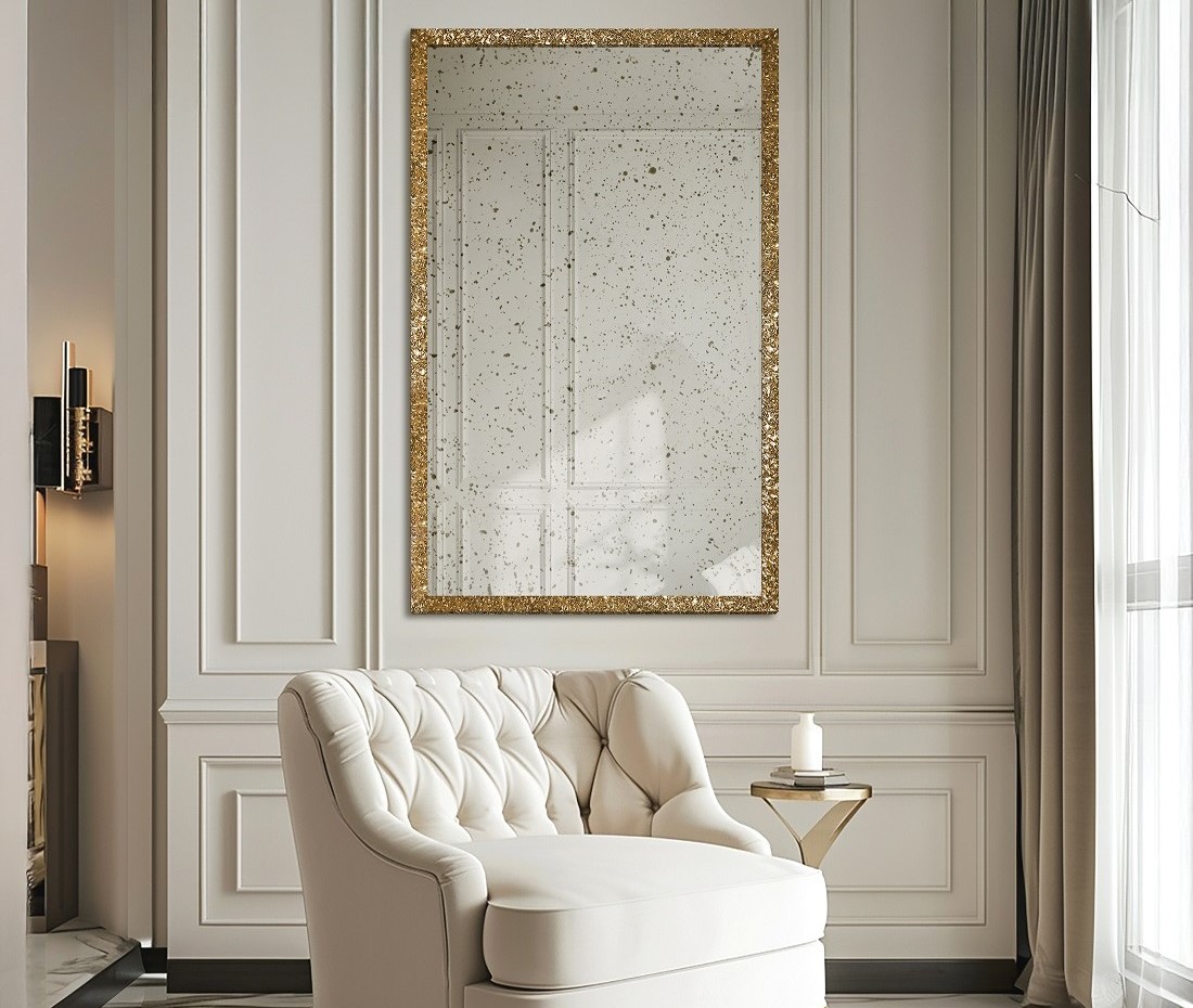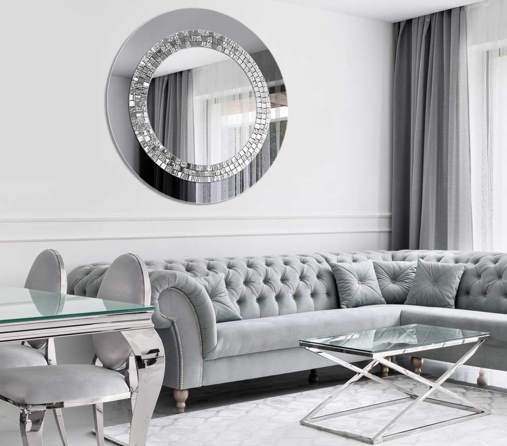Salon to przestrzeń, gdzie spędzamy czas z rodziną i przyjaciółmi, dlatego warto zadbać o jego reprezentacyjny charakter. Duże, ozdobne lustro glamour zawieszone nad sofą, komodą lub kominkiem stanie się centralnym punktem salonu, nadając mu klasy i blasku. Lustra w salonie odbijają zarówno światło dzienne, jak i sztuczne, co sprawia, że pomieszczenie staje się jaśniejsze i bardziej przestronne. Lustro do salonu powinno mieć dekoracyjną ramę np. złotą lub kryształową, która podkreśli aranżację glamour i wprowadzi wyjątkowy, luksusowy klimat.