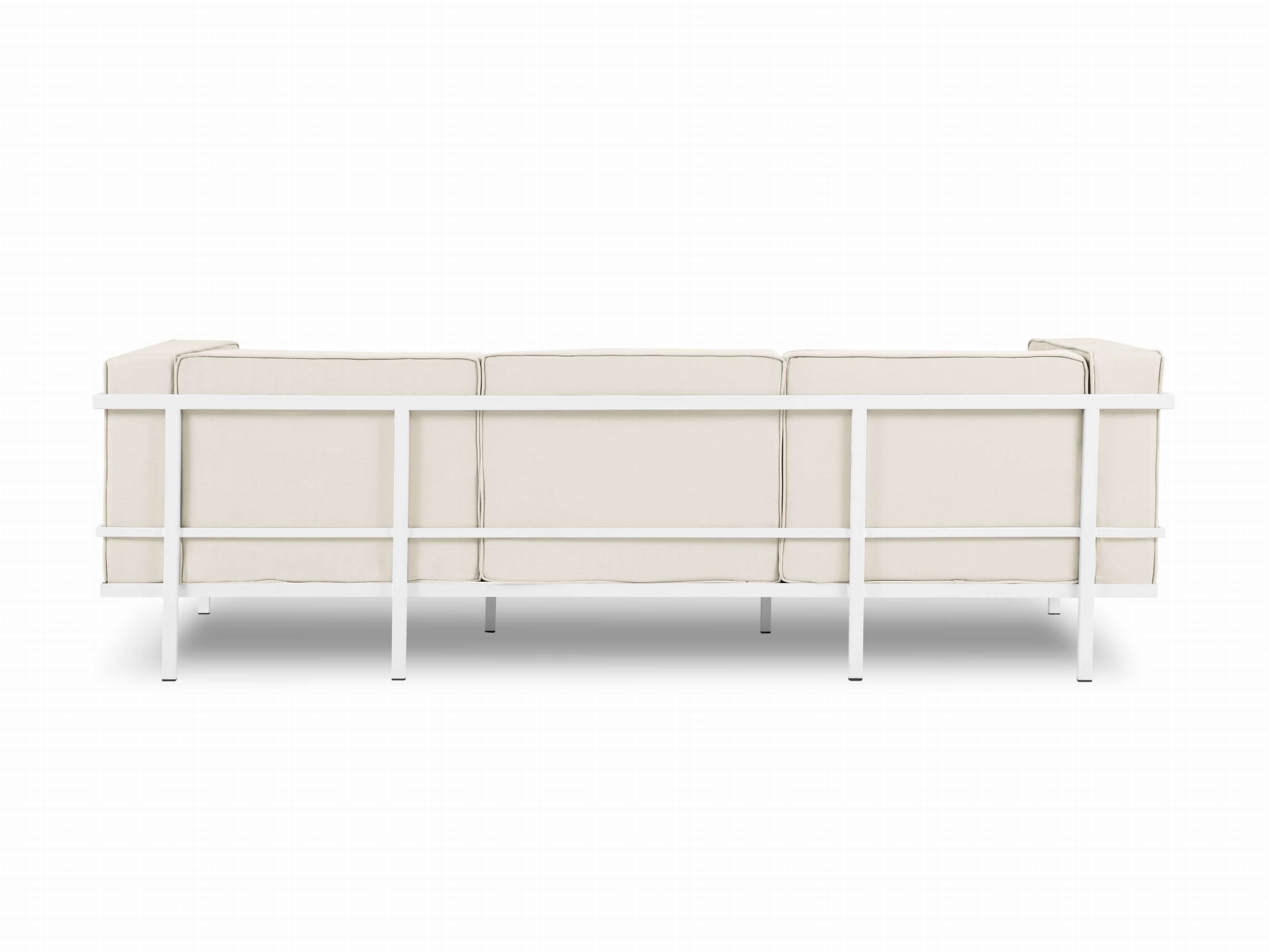 Jasna 3-osobowa sofa ogrodowa posiada białą, metalową konstrukcję, której elementem są wysokie (18 cm) nóżki.