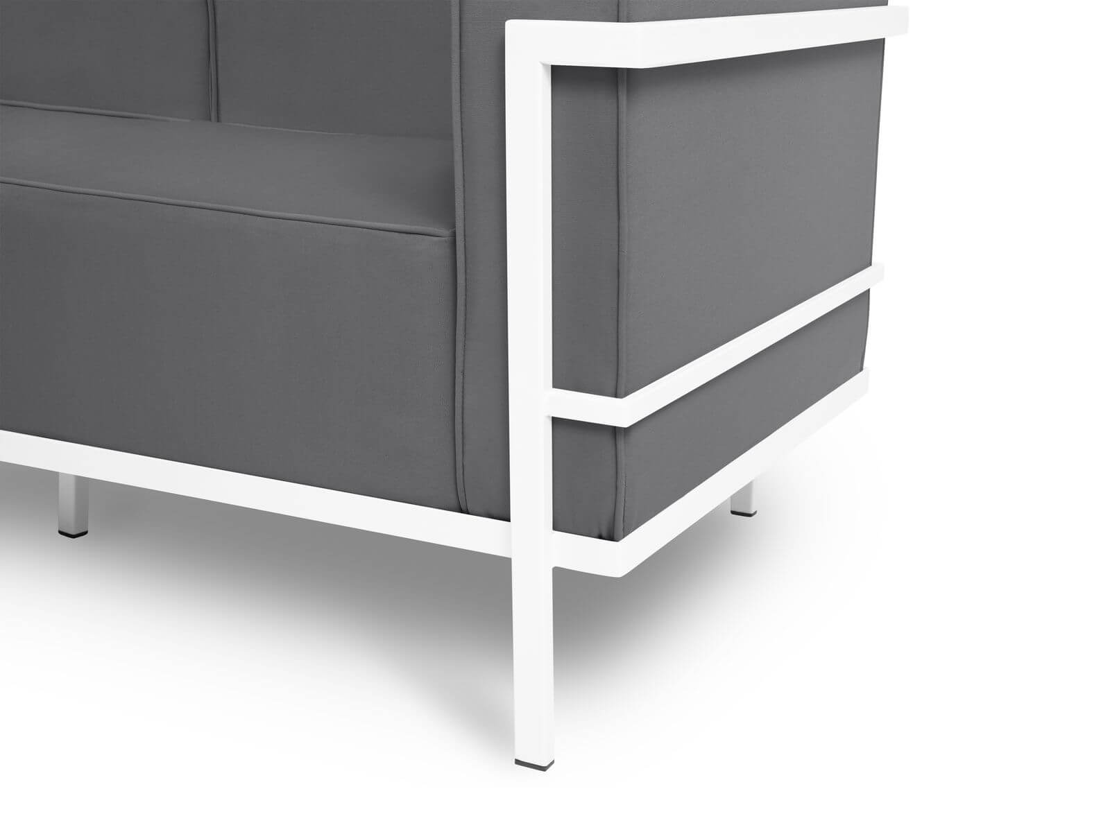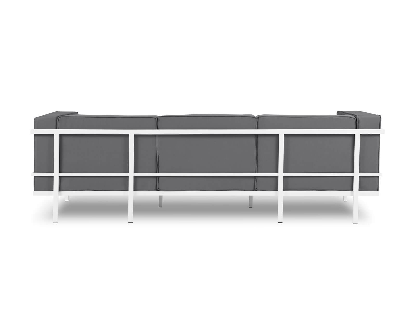 Trzyosobowa sofa ogrodowa Cannes w szarym odcieniu z metalową białą ramą. Mebel pełen stylu i estetyki do Twojego tarasu i ogrodu.