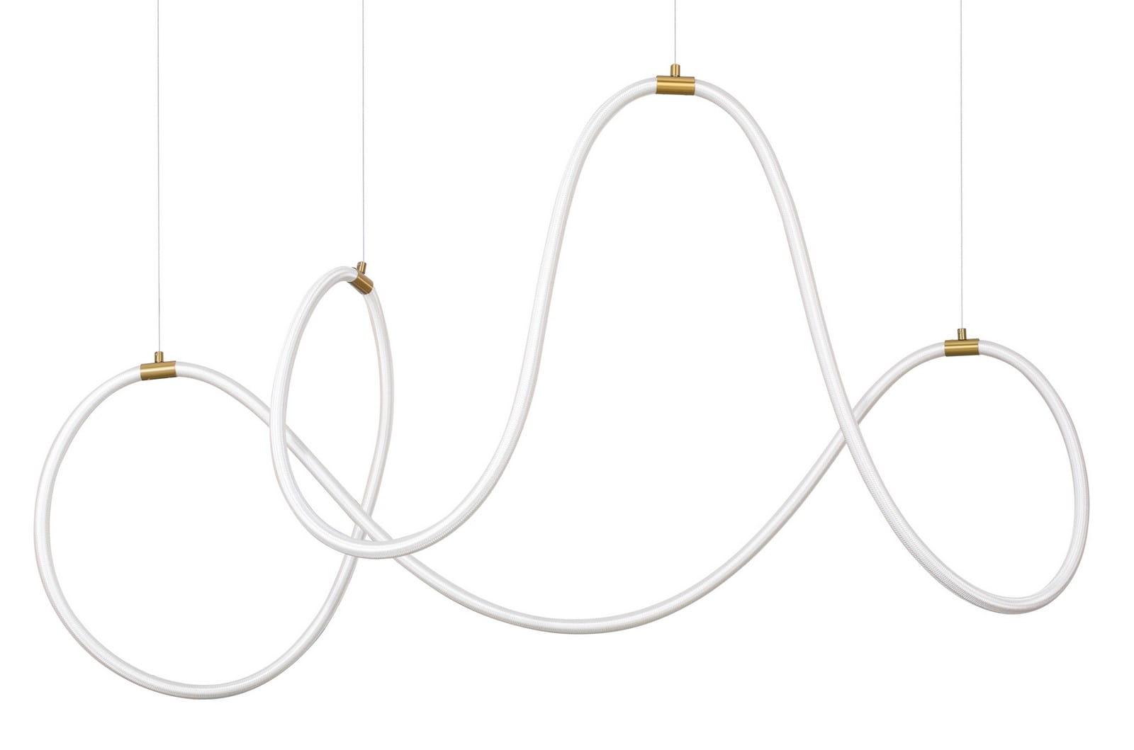 Klosz lampy składa się z białego węża wykonanego z wysokiej jakości silikonu, który formuje się w abstrakcyjny, powyginany kształt, przypominający modernistyczną rzeźbę zawieszoną w powietrzu. Faliste linie lampy oraz ukryte w kloszu źródło światła LED tworzą spektakularny efekt we wnętrzu, odpowiednio rozświetlając przestrzeń.