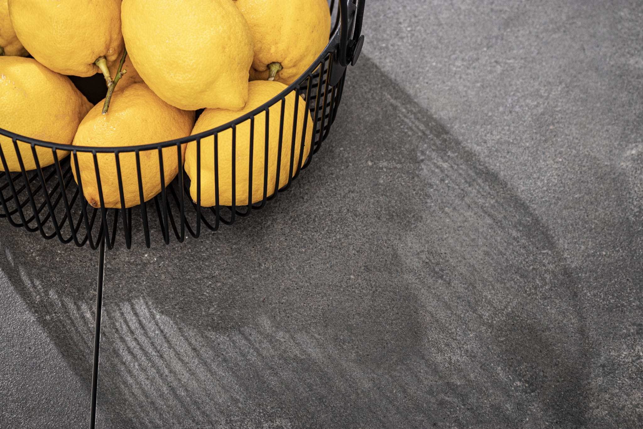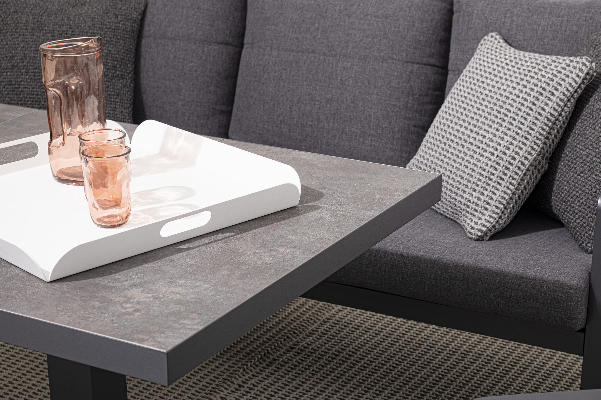Stół posiada jasną podstawę wykonaną z aluminium, która gwarantuje trwałość i odporność na warunki atmosferyczne. Szary blat ogrodowego stołu wykonany jest z ceramiki o grubości 10 mm.