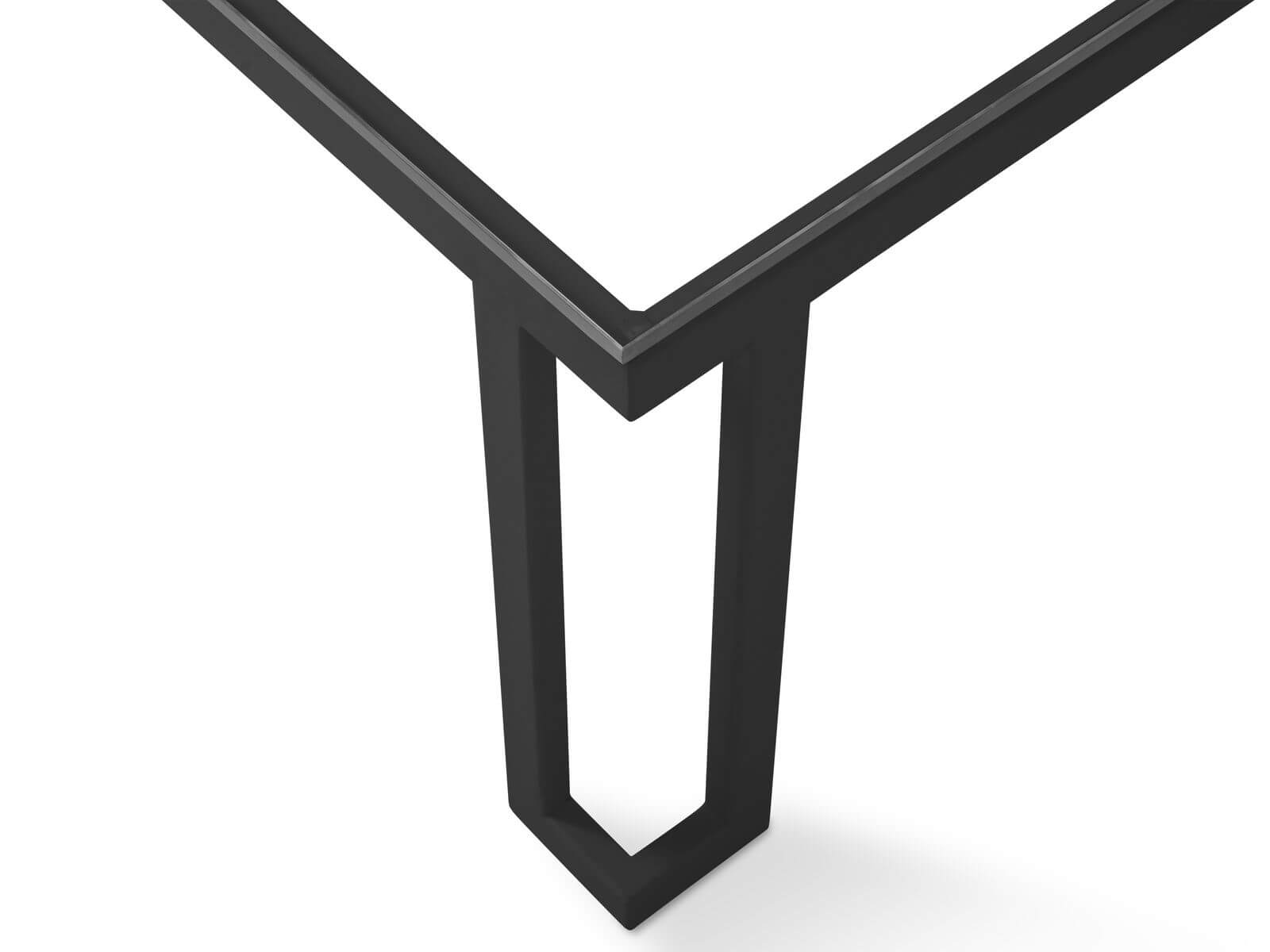 Transparentny blat stolika ogrodowego podtrzymywany jest przez stylową, antracytową konstrukcję z metalu.