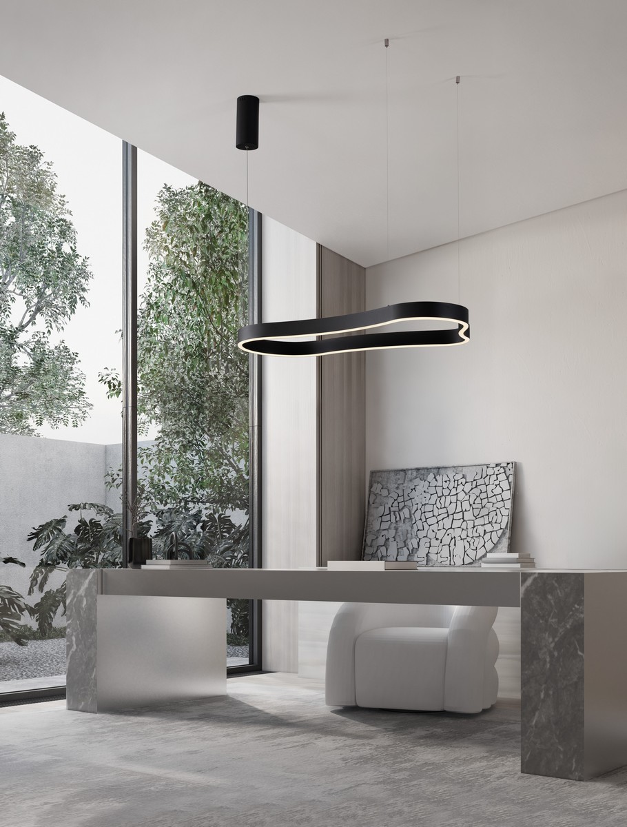 Lampa doskonale sprawdzi się jako centralny punkt nowoczesnych wnętrz — zarówno w jadalni, salonie, jak i przestrzeniach komercyjnych. Cienkie linki zawieszenia potęgują efekt lekkości, sprawiając wrażenie, jakby lampa unosiła się w powietrzu.