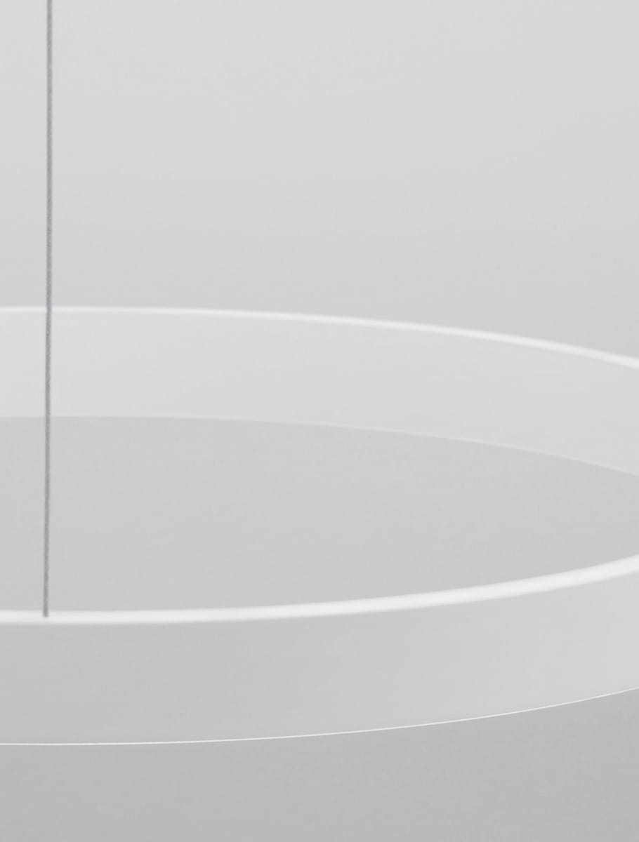 Lampa wykonana została z aluminium w białym kolorze o matowym wykończeniu i ma formę masywnego ringu z wbudowanym źródłem światła LED. Osłonę klosza wykonano z akrylu w mlecznym odcieniu, który subtelnie tonuje moc oświetlenia, tworząc przyjemny klimat.