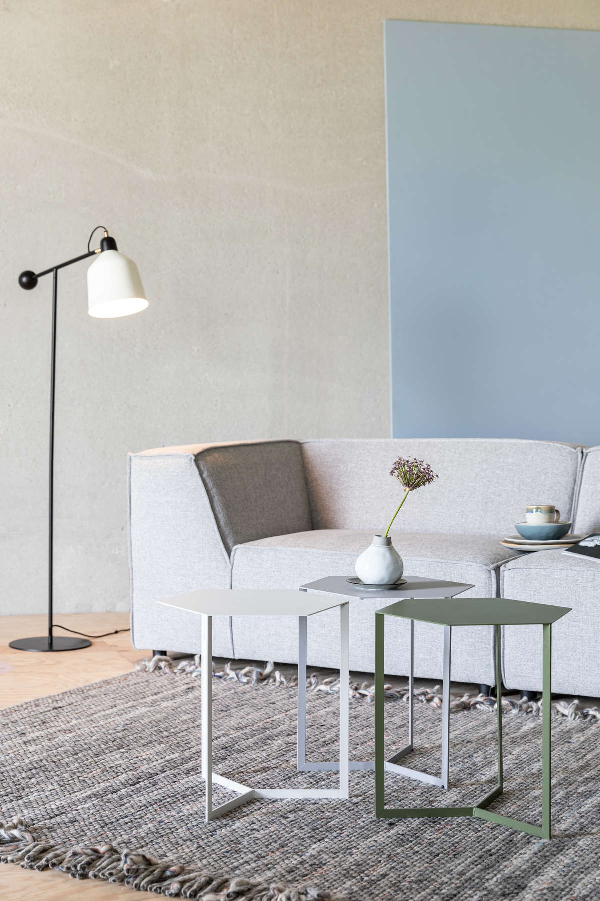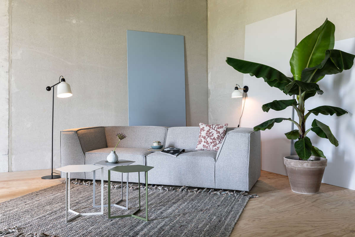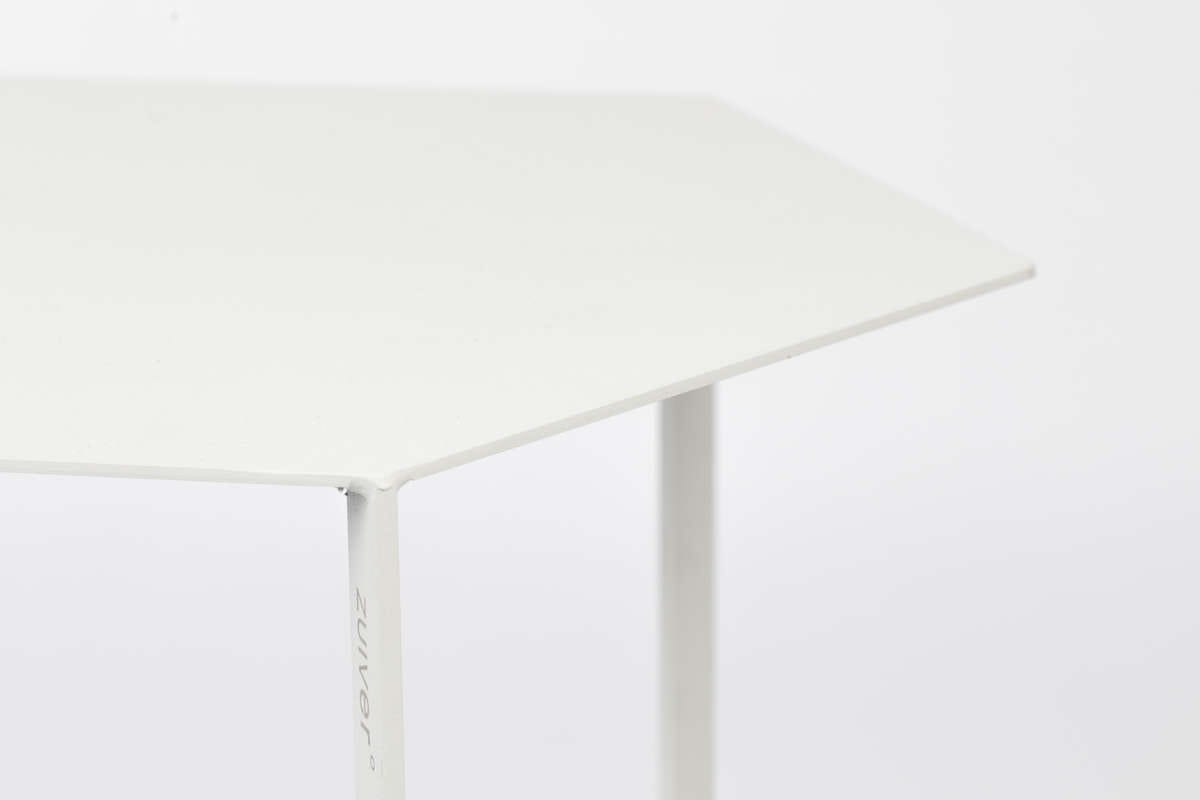 Nietypowy, bo sześciokątny kształt blatu zwiastuje, że mamy do czynienia z nowoczesnym projektem. Ten kawowy stolik o zgaszonym, przyjemnym dla oka jasnoszarym kolorze, stanowi część większej kolekcji. Oczywiście doskonale prezentuje się on solo, ale ciekawym rozwiązaniem kompozycyjnym może być również zestawienie ze sobą egzemplarzy w różnych kolorach i ustawienie ich w taki sposób, by boki przylegały do siebie. Taki układ, przywodzący na myśl plaster miodu, da bardzo dekoracyjny efekt i pozwoli wygospodarować sporo miejsca na codzienne drobiazgi. Materiał wykonania to malowane proszkowo żelazo.