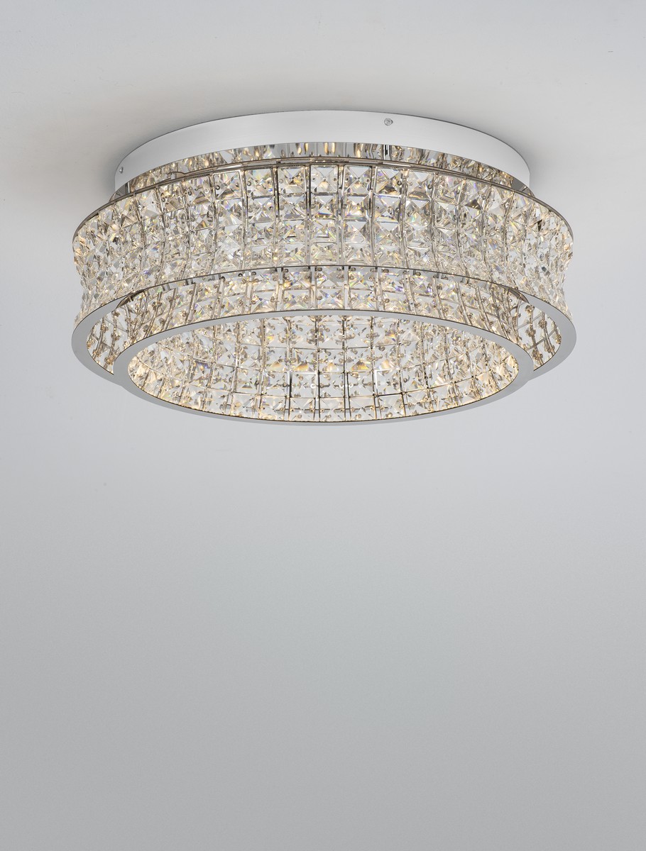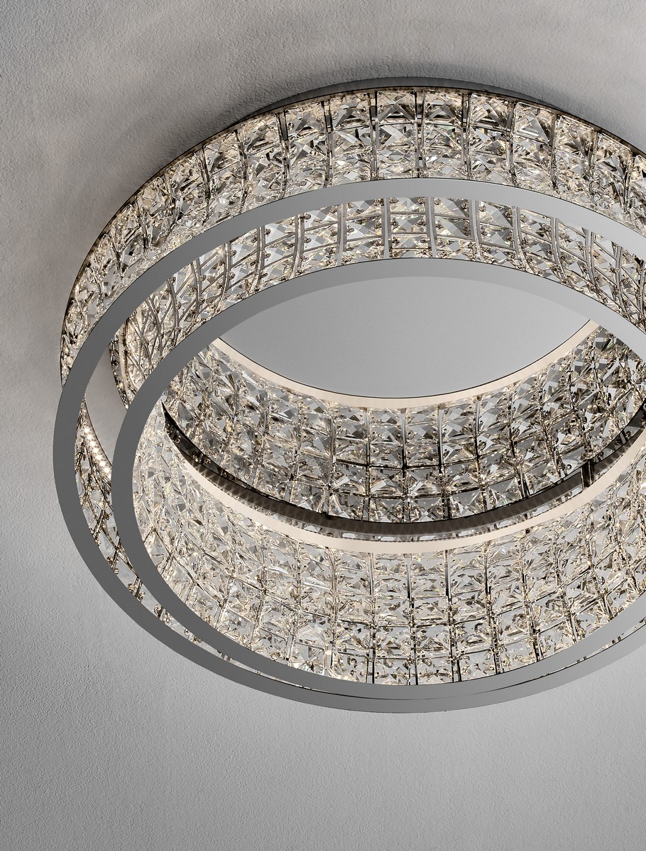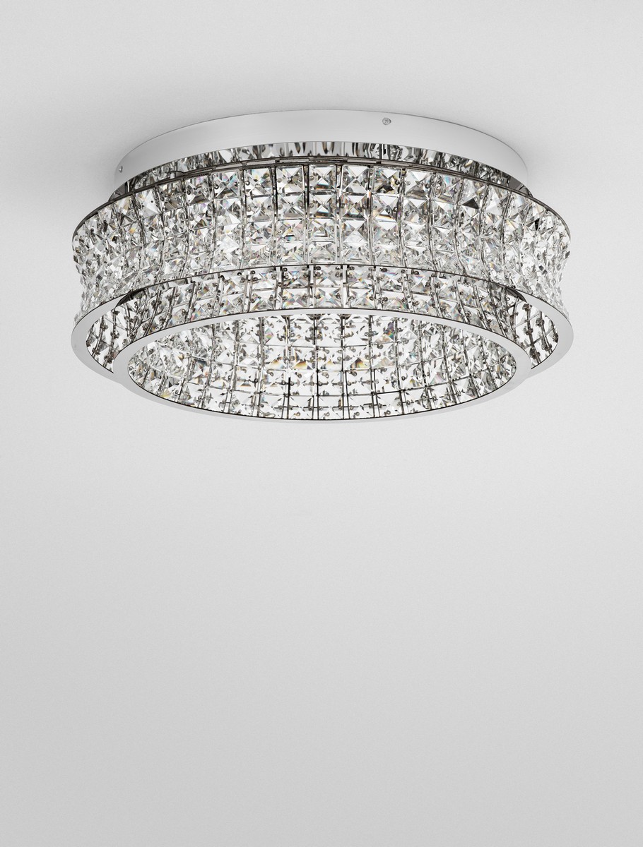 Plafon Arona od marki Nova Luce to spektakularny element dekoracyjny, który w mistrzowski sposób łączy klasyczną elegancję z nowoczesną formą. W powiększonym wariancie o średnicy 60 cm, oprawa robi niesamowite wrażenie. Wykonana z polerowanej, chromowanej stali nierdzewnej oraz najwyższej jakości transparentnych kryształów, przyciąga wzrok swoją bogatą, dwupoziomową budową. Misternie oszlifowane detale wspaniale załamują światło, dodając wnętrzu luksusowego i prestiżowego charakteru w stylu glamour.