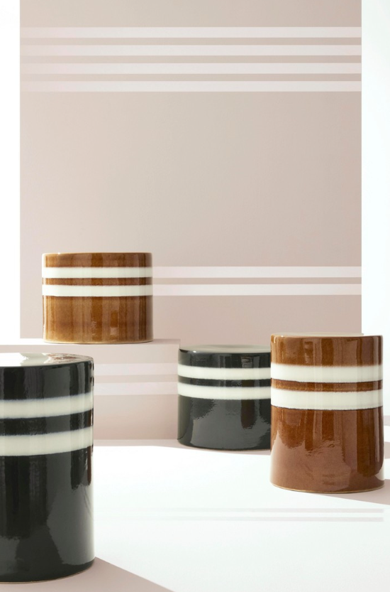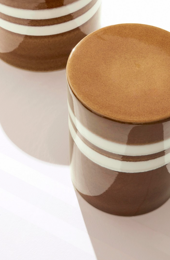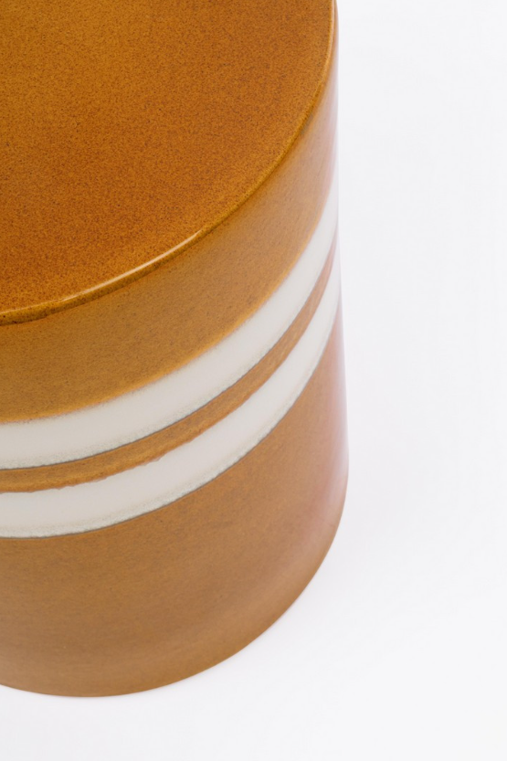 Ceramiczny stolik dekoracyjny w odcieniu miodowego brązu to stylowy element wyposażenia, który zachwyca smukłą, elegancką formą. Wykonany z glazurowanej ceramiki, wyróżnia się ciepłym kolorem zestawionym z geometrycznym akcentem białych pasów, co nadaje mu nowoczesny i niepowtarzalny charakter.