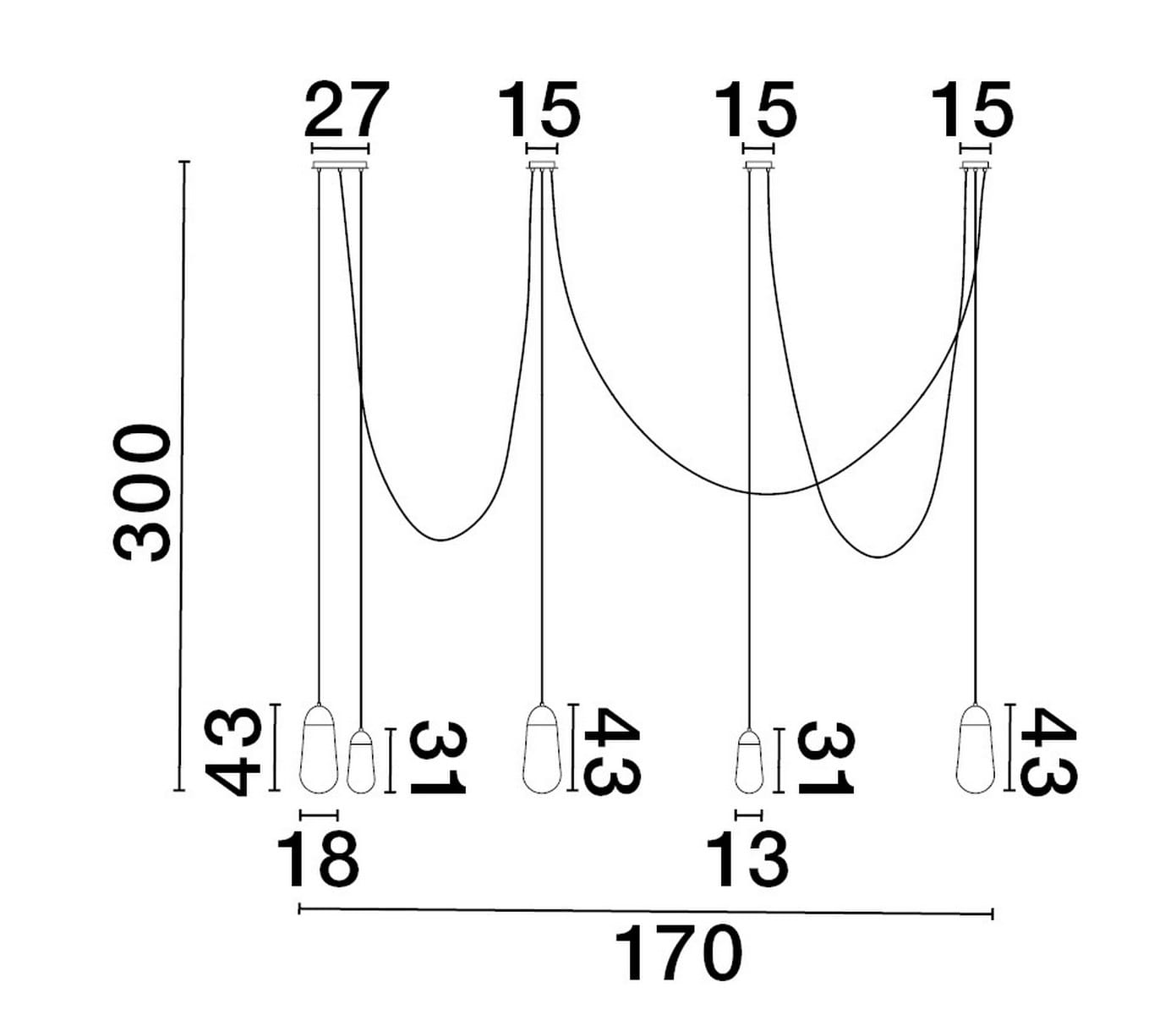 Minimalistyczne klosze o wydłużonym kształcie składają się z białej osłonki wykonanej ze szkła oraz czarnej, metalowej nakładki. Elementy płynnie łączą się ze sobą, tworząc jednolitą, owalną formę. Lampa składa się z pięciu takich kloszy, zawieszonych na długim, czarnym kablu, który tworzy swobodną i oszczędną w środkach kompozycję, dodatkowo podkreślając surowy charakter całości. Zastosowanie kloszy o różnych wielkościach dodaje lampie niebanalnego charakteru, a zestawienie kontrastującej, czarno-białej kolorystki jest uniwersalnym rozwiązaniem o ponadczasowym klimacie. Lampę utrzymują 4 okrągłe podsufitki, które możesz rozmieścić na suficie w dowolny sposób i stworzyć unikatową aranżację.