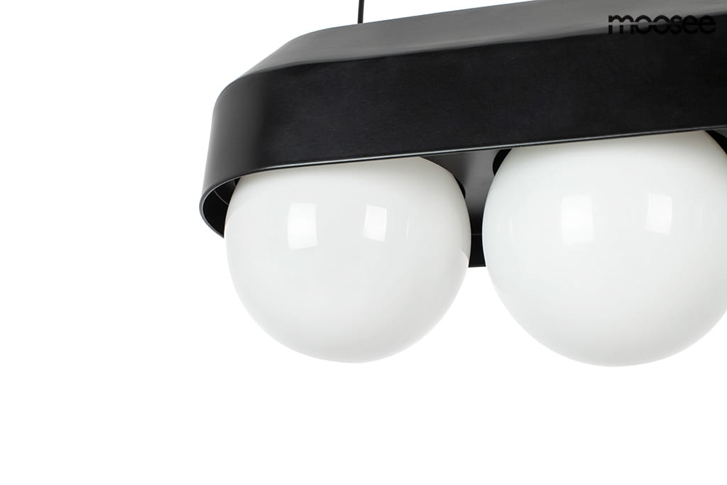 Klosze wykonane z wysokiej jakości szkła o wykończeniu w kolorze białym. Podstawa wykonana ze stali węglowej, dzięki czemu lampa jest wytrzymała i odporna na pęknięcia. Połączenie klasycznej czerni z trzema białymi kulami daje szeroki wachlarz aranżacyjny.