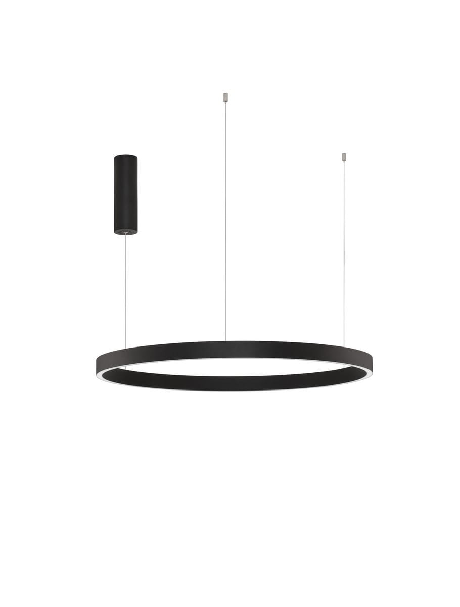 Lampa wykonana została z aluminium w czarnym kolorze o matowym wykończeniu i ma formę masywnego ringu z wbudowanym źródłem światła LED. Osłonę klosza wykonano z akrylu w mlecznym odcieniu, który subtelnie tonuje moc oświetlenia, tworząc przyjemny klimat.