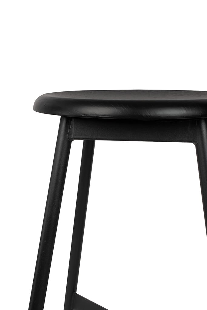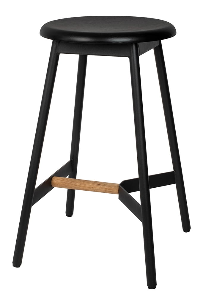 Siedzisko zostało wykonane z fornirowanej płyty MDF oraz stabilnej metalowej postawy w kolorze czarnym. Cztery nogi stołka zostały ze sobą połączone w ciekawy sposób za pomocą drewnianego wspornika, który nie tylko pełni funkcję podnóżka, ale również sprawia, że stołek jest bardziej stabilny.