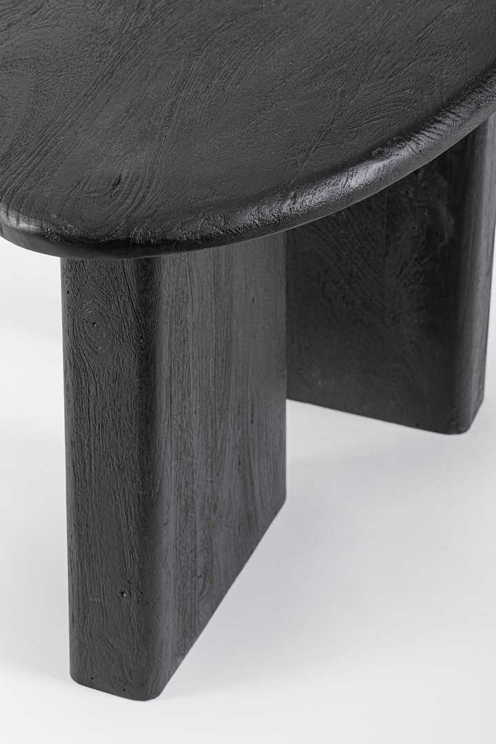 Stolik kawowy Zacatecas to designerski mebel akcentujący, który łączy surową, organiczną formę z monochromatyczną estetyką. Wykonany z litego drewna mango, ma głębokie, czarne wykończenie na bazie nitrocelulozy, które wydobywa naturalną, chropowatą fakturę drewna. Jego nieregularny, zaokrąglony blat spoczywa na dwóch masywnych, trapezoidalnych podstawach, tworzących stabilną i rzeźbiarską sylwetkę. Pionowa szczelina między bazami nadaje meblowi wizualnej lekkości i unikalnego charakteru.