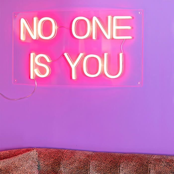 Głośna w designie i nieskrępowana z natury, jest to wisząca neonowa dekoracja LED, która nigdy nie przestanie być tematem do rozmowy. Komunikat „No one is you” jest przymocowany do przezroczystej akrylowej tablicy.