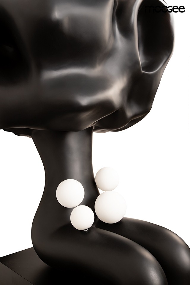 Monumentalna konstrukcja o wysokości aż 205 cm została wykonana z matowego, czarnego włókna szklanego, które nadaje rzeźbie szlachetności i nowoczesnego sznytu. Całość spoczywa na minimalistycznej, stabilnej podstawie wykonanej ze stali, która harmonijnie dopełnia sylwetkę. W centralnej części rzeźby umieszczono cztery mleczne klosze z matowego szkła o zróżnicowanych średnicach, które miękko i nastrojowo rozpraszają światło.