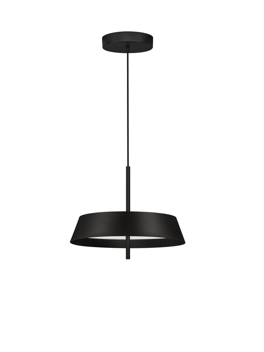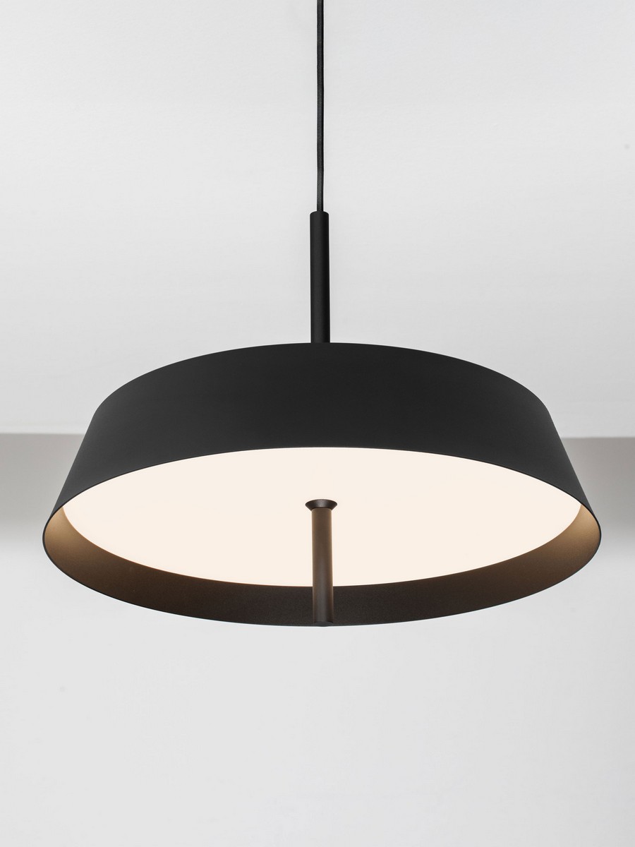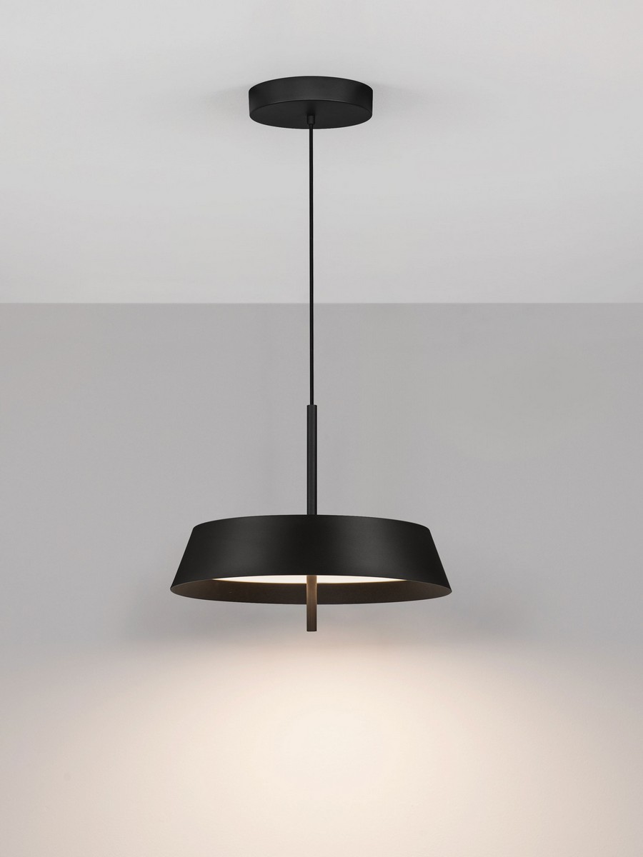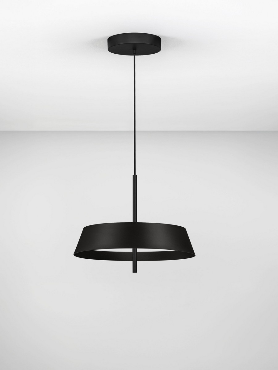 Lampa wisząca Aguila to wyrazista, a zarazem minimalistyczna oprawa, która doskonale definiuje nowoczesny styl oświetlenia. Szeroki, geometryczny klosz o średnicy 35 cm został precyzyjnie wykonany ze stali i aluminium, a całość wykończono w szlachetnym odcieniu piaskowej czerni. Matowa struktura powierzchni nadaje lampie luksusowego charakteru, sprawiając, że staje się ona intrygującym akcentem dekoracyjnym.