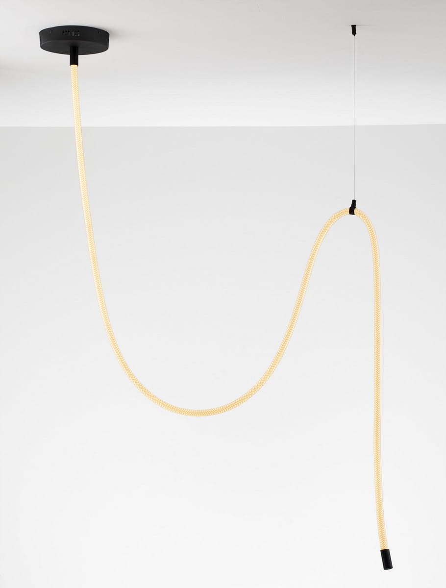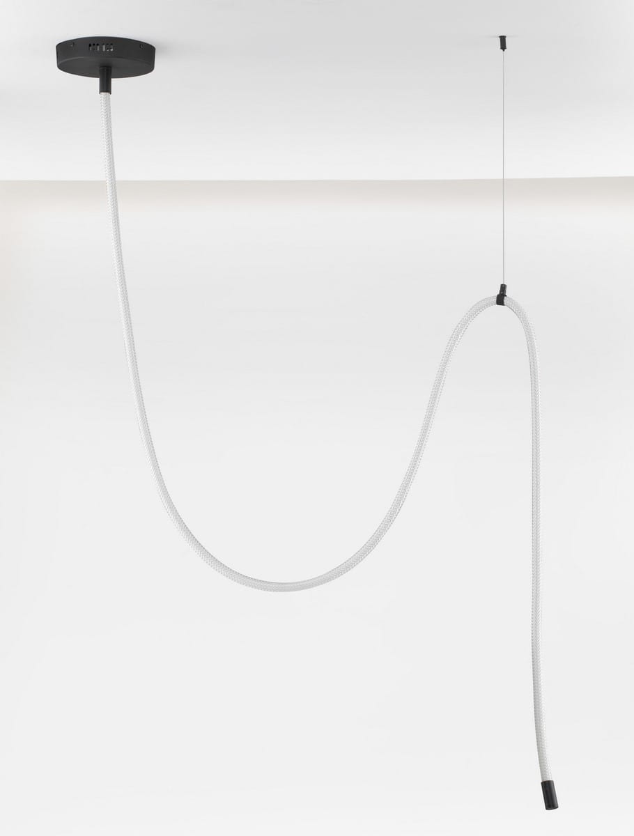 Lampa wisząca Cura to odważny i nowoczesny element oświetleniowy, który wyróżnia się swoją nietuzinkową formą i minimalistycznym stylem. Wijąca się forma nadaje całości dynamicznego charakteru i sprawia, że lampa wygląda niczym dzieło sztuki zawieszone w powietrzu. Korpus wykonany z białego silikonu tworzy miękkie linie, które subtelnie przenikają przestrzeń, a stalowe elementy, takie jak podsufitka i mocowania, dodają całości wyrazistego, industrialnego akcentu.