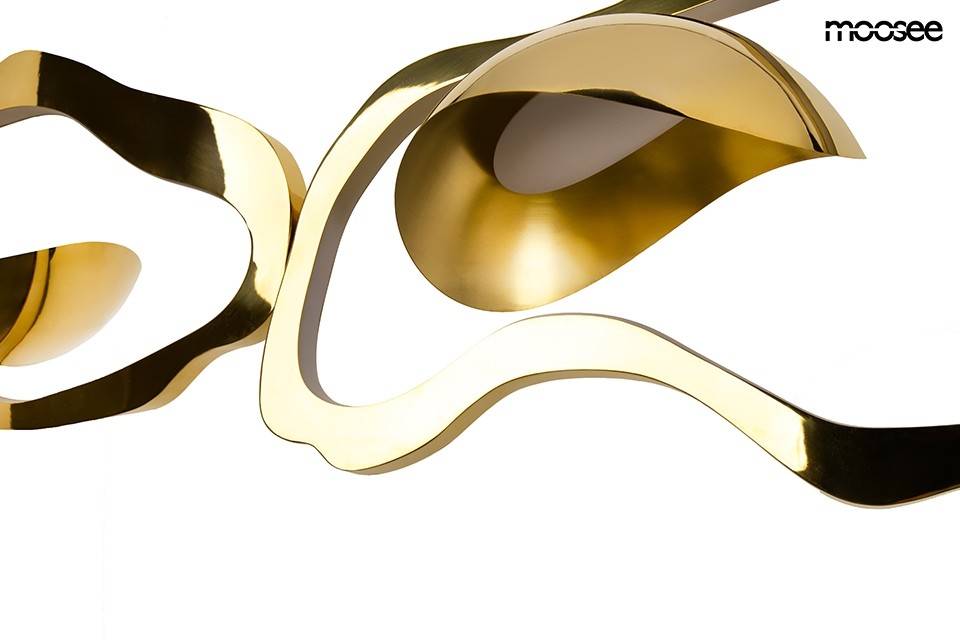 Sercem lampy są wewnętrzne elementy w formie półksiężyców, które skrywają wydajne źródło światła LED o mocy 54 W. Strategiczne rozmieszczenie punktów świetlnych sprawia, że blask subtelnie odbija się od złotych płaszczyzn, tworząc w pomieszczeniu ciepłą, przytulną aurę i efektowną grę światłocienia. Dzięki imponującej szerokości 210 cm oraz możliwości regulacji długości przewodów, lampa staje się dominującym elementem dekoracyjnym, idealnym do zawieszenia nad dużym stołem w jadalni, w przestronnym salonie lub reprezentacyjnym holu.