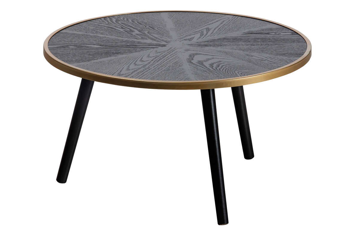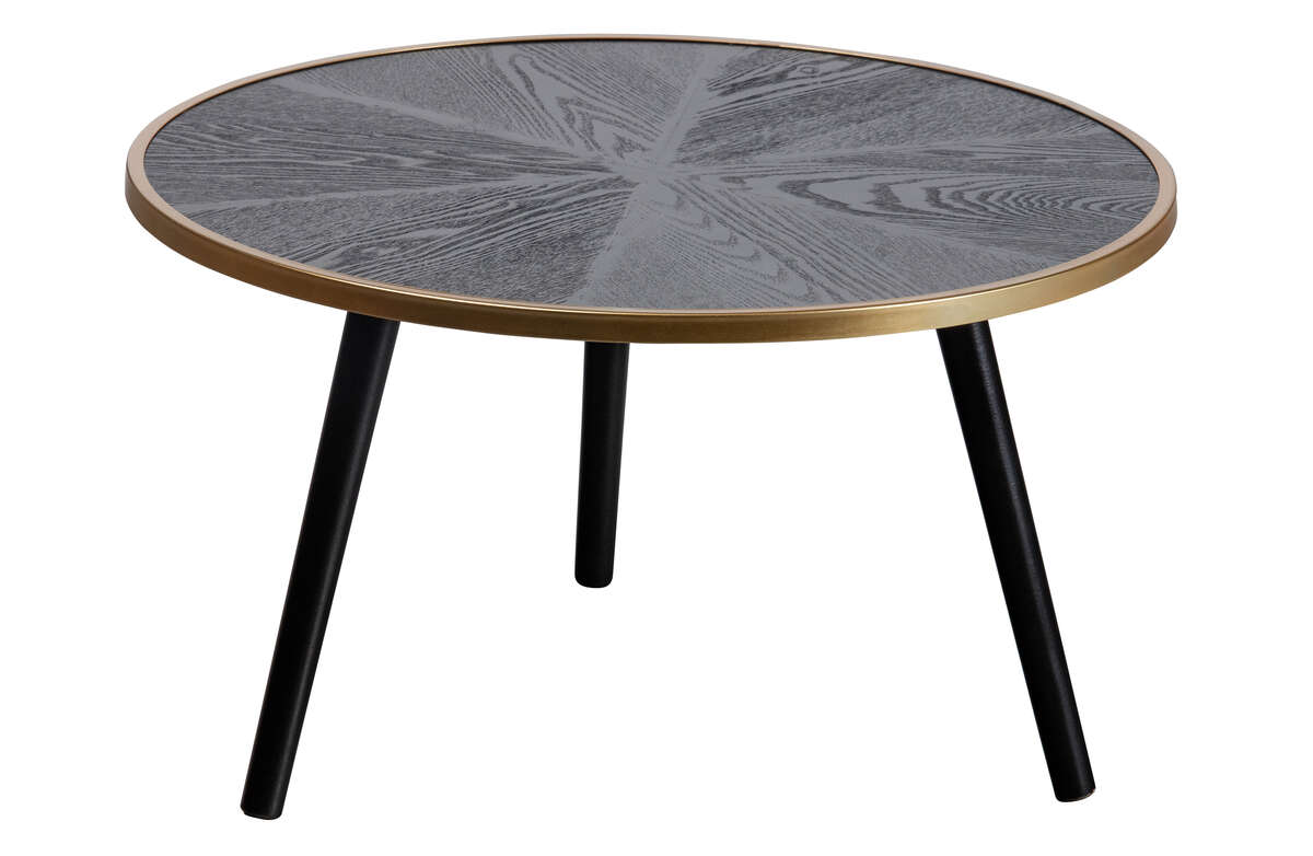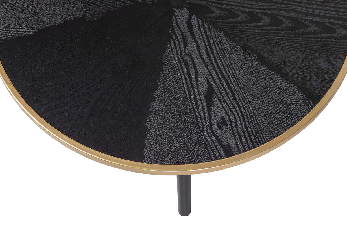 Stolik Binck przyciąga wzrok przede wszystkim za sprawą bardzo oryginalnego blatu. Rozchodzące się promieniście słoje tworzą na nim urokliwą mozaikę. Czerń pięknie komponuje się ze złotą metalową obwolutą. Cienkie metalowe nogi zapewniają mu stabilność i stanowią eleganckie uzupełnienie całej konstrukcji.