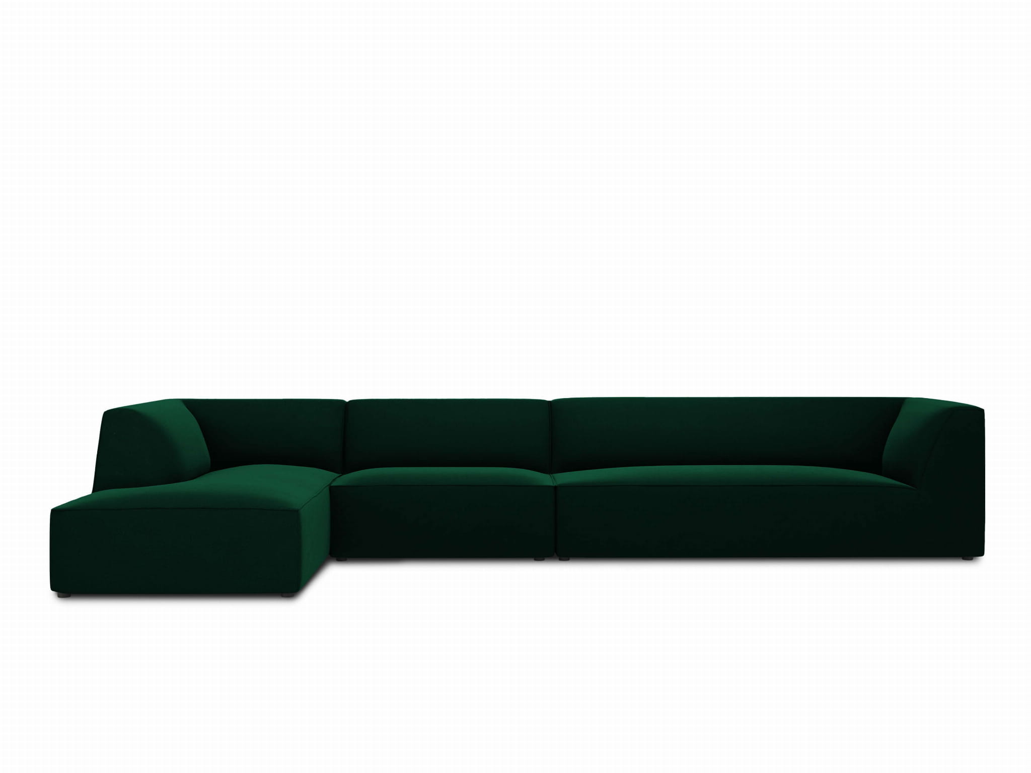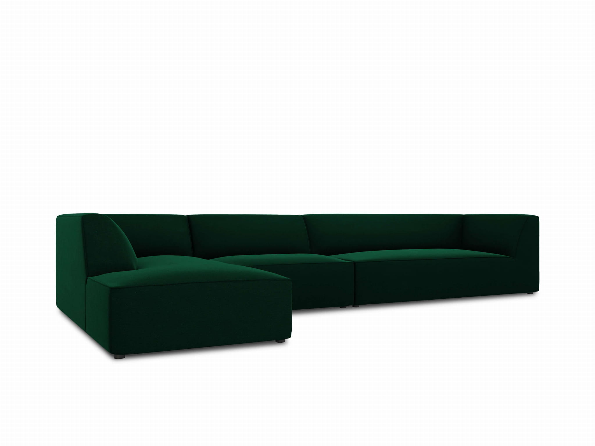 5-osobowa, butelkowo zielona sofa narożna ustawiona jest na niskich, 3-centymetrowych czarnych nóżkach.