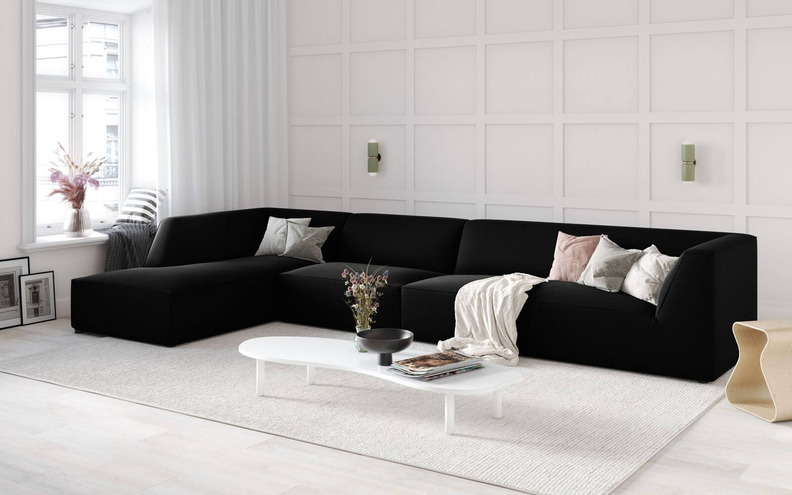 5-osobowa, czarna sofa narożna ustawiona jest na niskich, 3-centymetrowych czarnych nóżkach.
