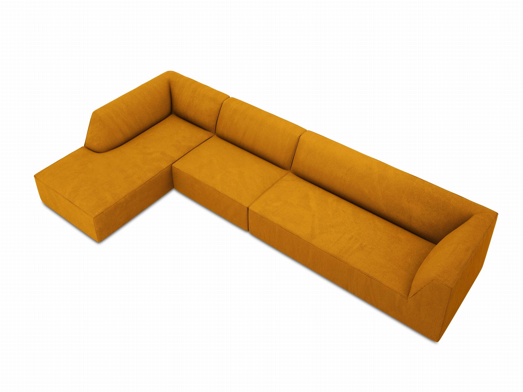 Obszerna, żółta sofa narożna tapicerowana przyjemną tkaniną sztruksową - idealna do dużego salonu.