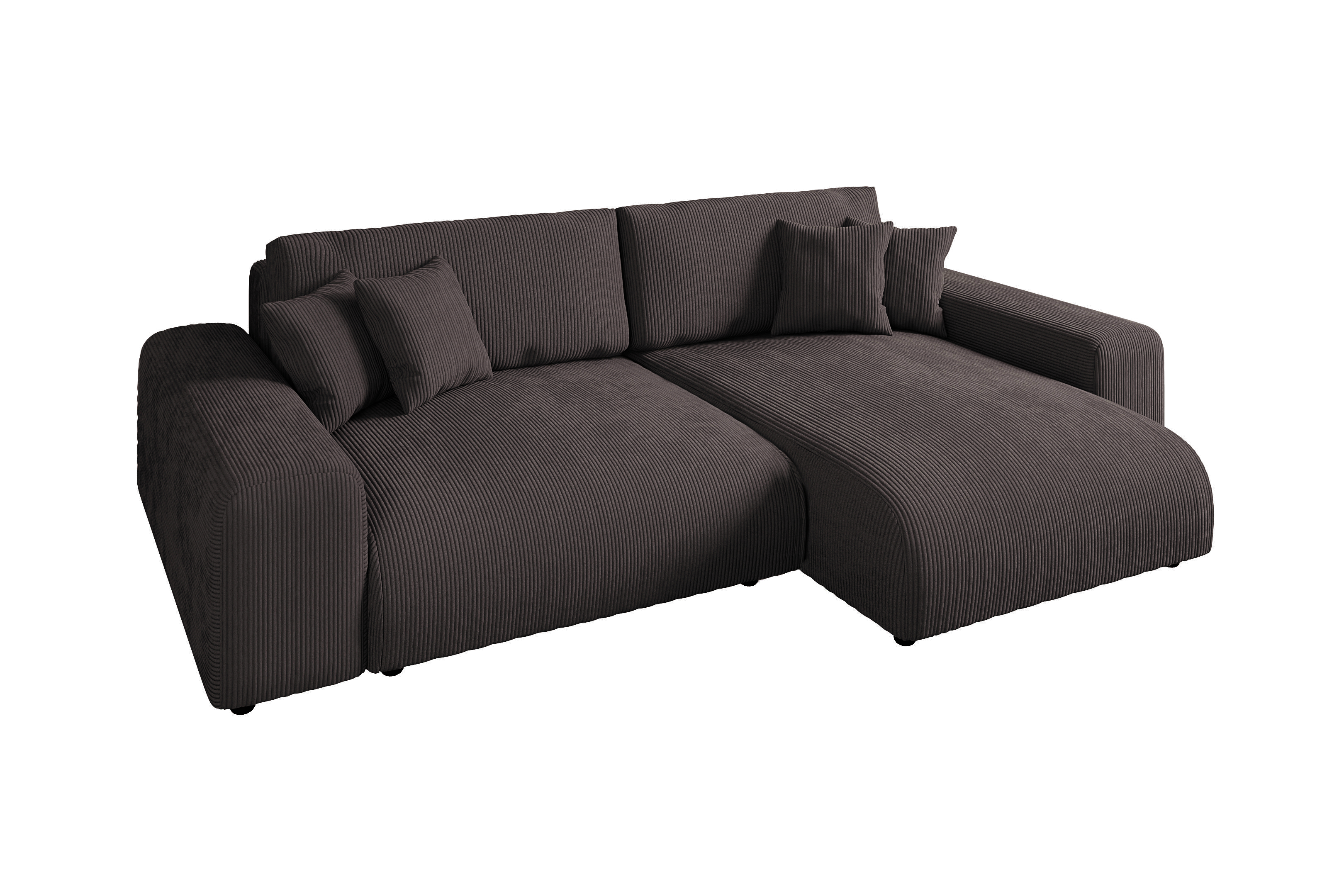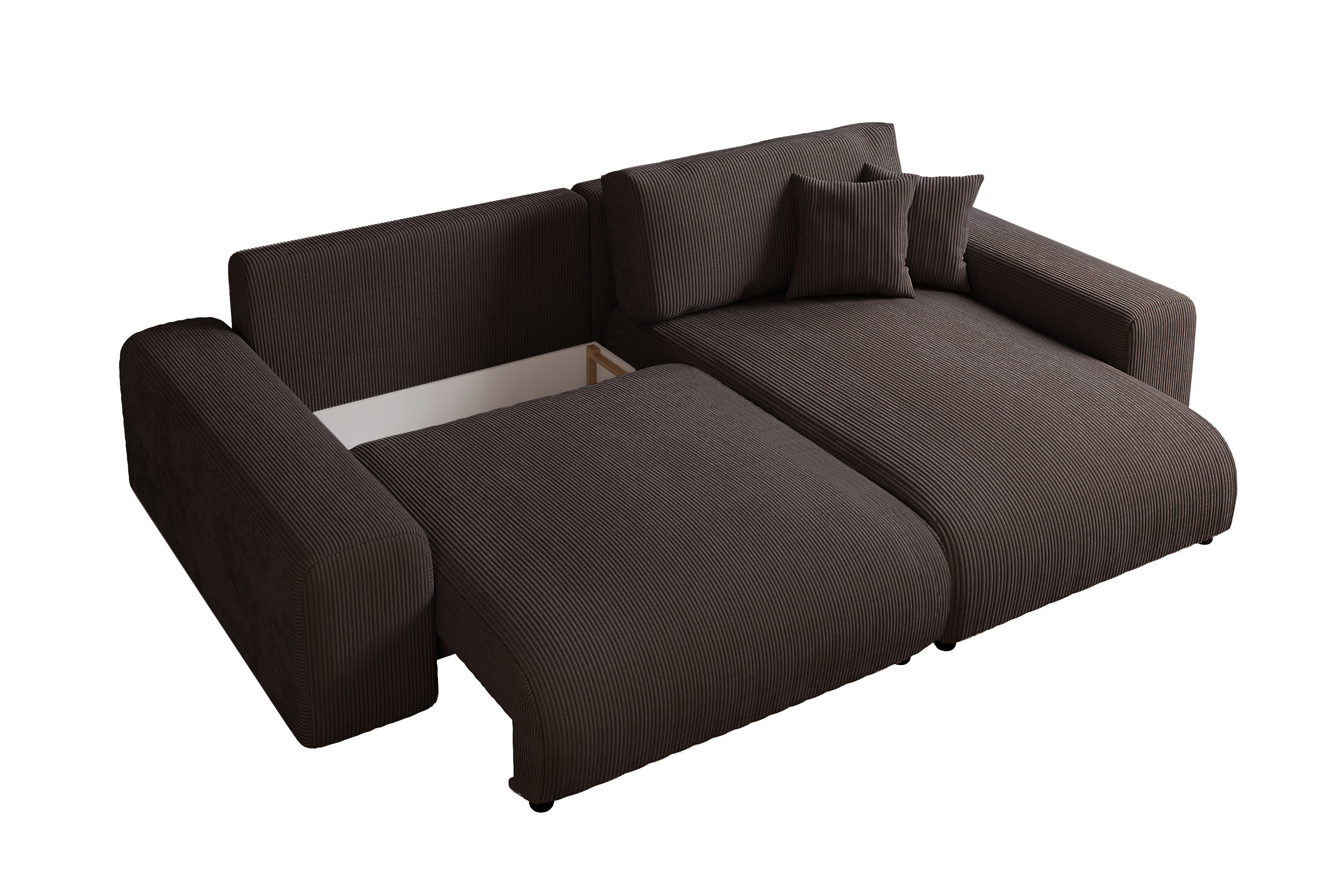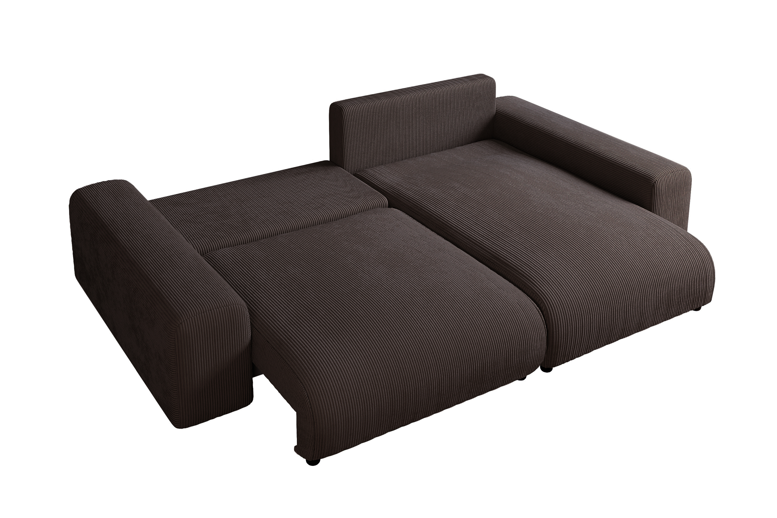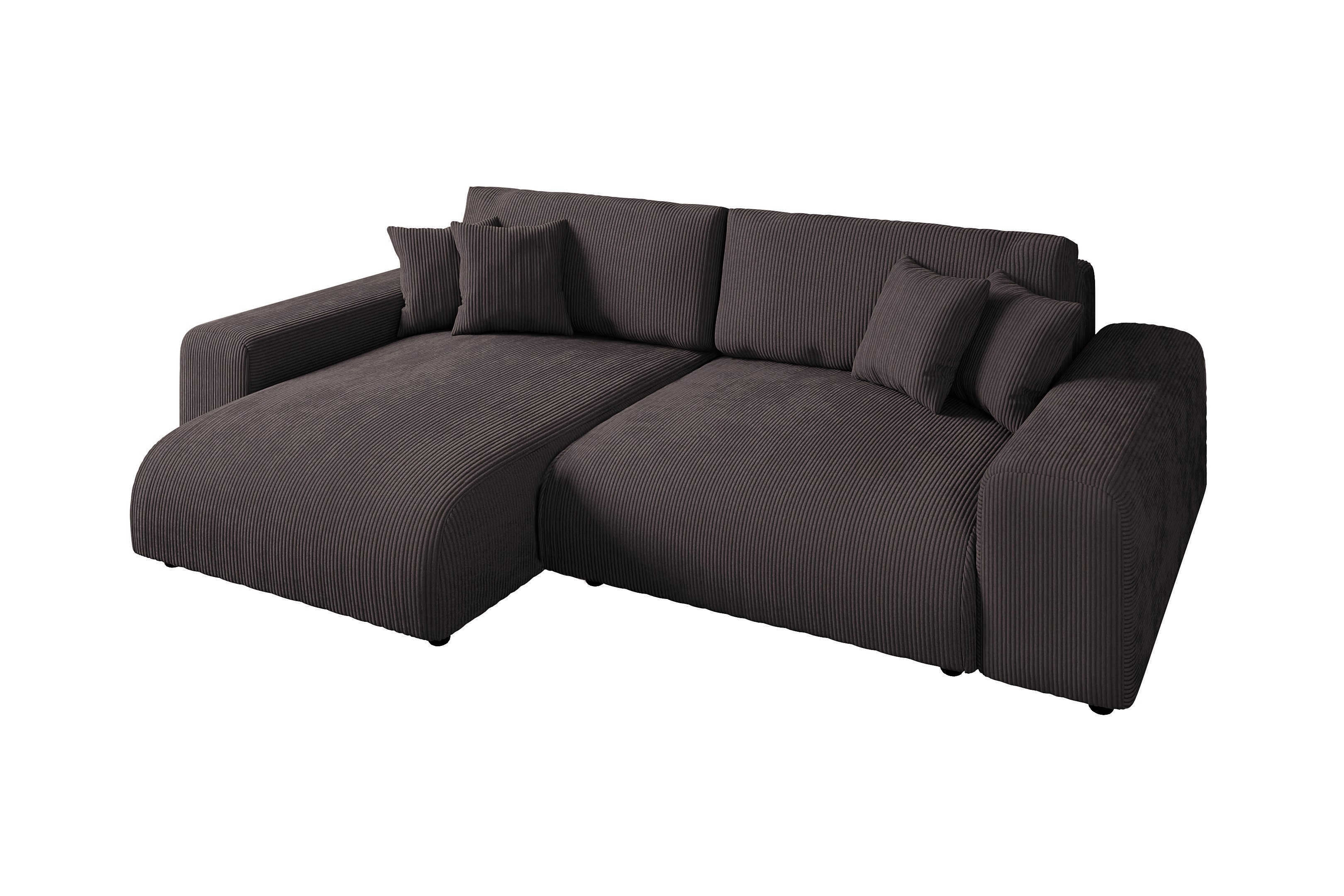 Narożnik posiada praktyczną funkcję spania, co pozwala łatwo przekształcić go w wygodne łóżko dla gości. Mebel jest umieszczony na niskich, dyskretnych nóżkach (5 cm), co podkreśla jego masywną formę.