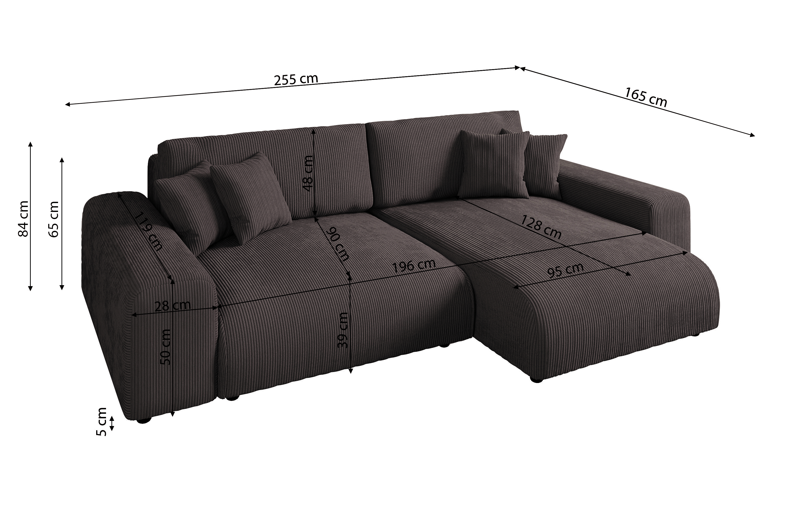 Tapicerowana jest modną tkaniną Lincoln 29 (sztruks/welur prążkowany) w głębokim, brązowym odcieniu. Ten wyjątkowo komfortowy model o szerokości 255 cm i głębokości 168 cm, stanowi centrum domowego wypoczynku, oferując wygodę leżanki i możliwość ułożenia się w pozycji półleżącej.