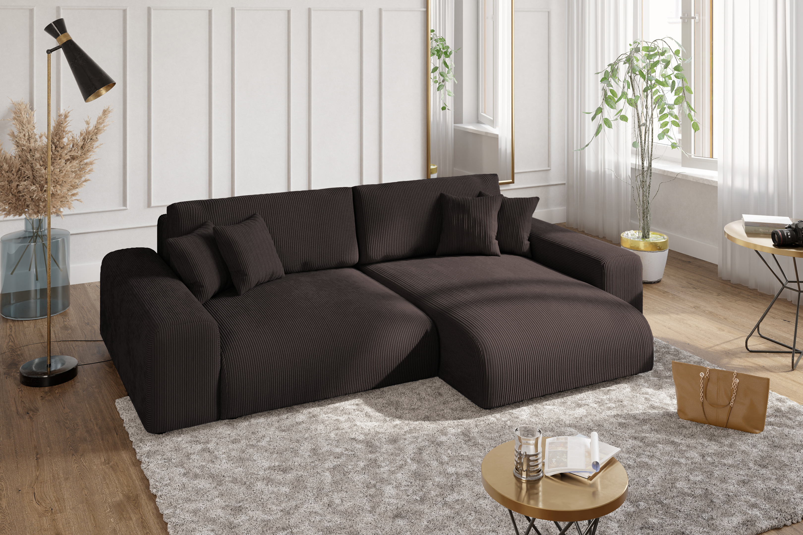 Duża sofa narożna z funkcją spania Mana brązowa tkanina welurowa