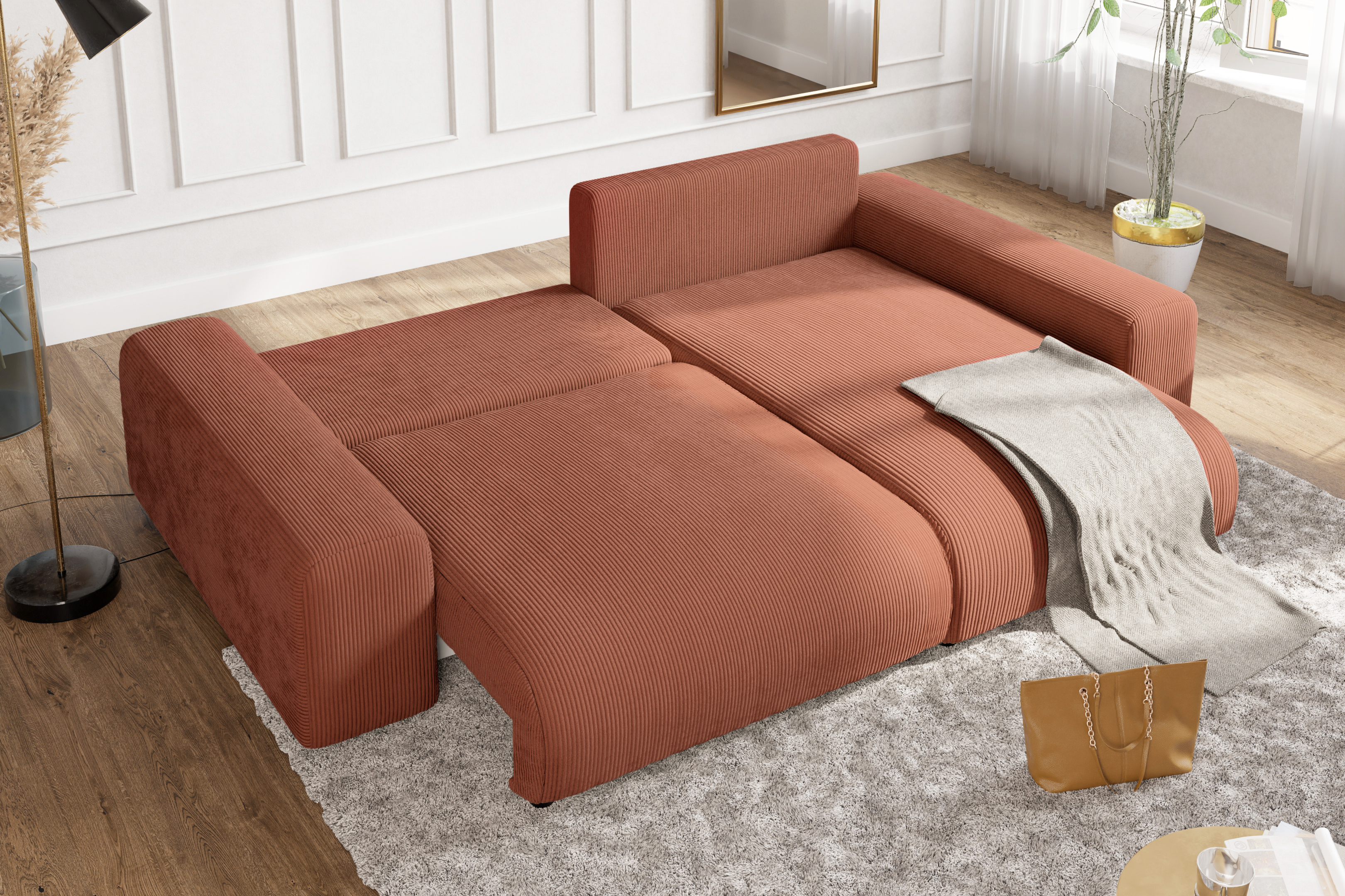 Duża sofa narożna z funkcją spania Mana w welurowej tkaninie ceglastego koloru