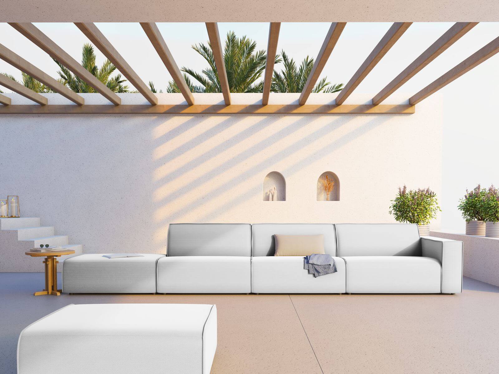 Tkanina Ibiza, użyta do obicia szarej, obszernej sofy ogrodowej, to materiał stworzony specjalnie do mebli zewnętrznych. Materiał charakteryzuje się wyrazistą strukturą drobnej plecionki. Włókna tkaniny są wytrzymałe na promieniowanie UV i nie blakną pod wpływem słońca. Dodatkowo, tkanina Ibiza opóźnia wnikanie płynów. Jest przewiewna, posiada właściwości antybakteryjne i antygrzybiczne, a także jest odporna na zaciągnięcia i zadrapania. Niektóre odcienie materiału posiadają dwukolorowy splot, dodając meblom jeszcze większego uroku.