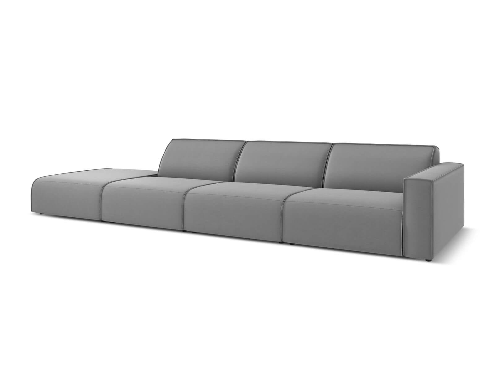 Szara, duża sofa ogrodowa Maui charakteryzuje się asymetryczną bryłą o nowoczesnym designie. Podłokietnik znajduje się tylko z jednej strony, zaś z drugiej wyeksponowane jest okazałe, wydłużone siedzisko.