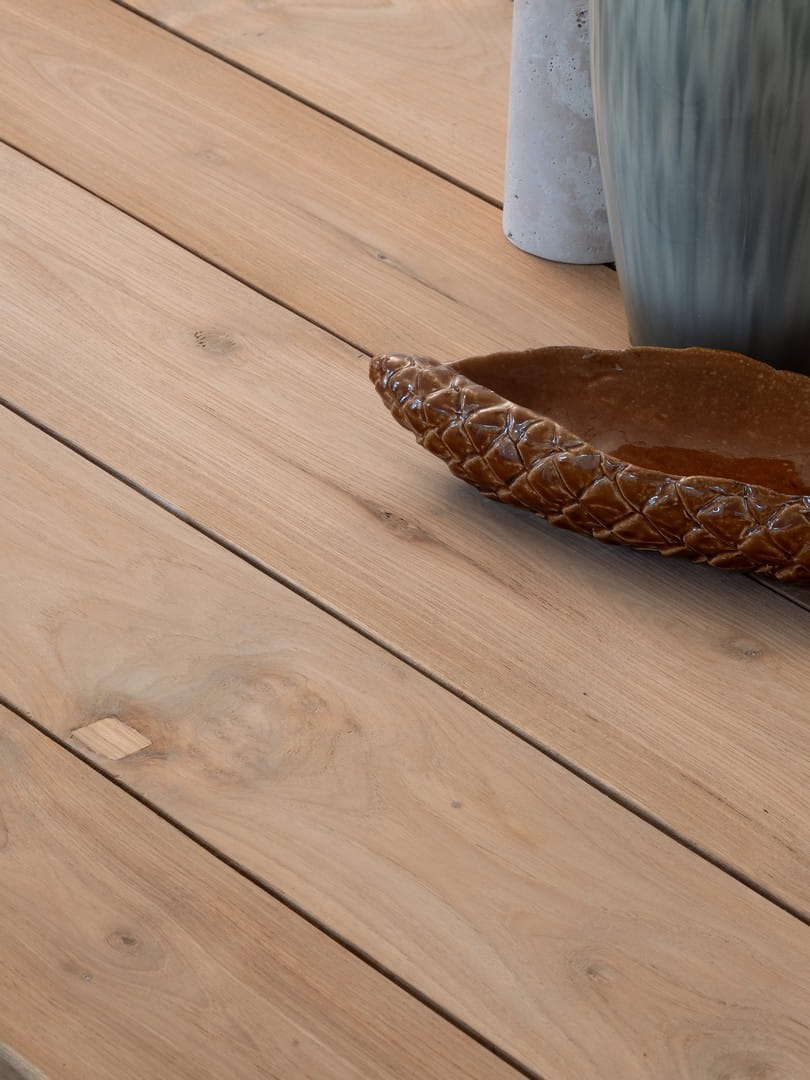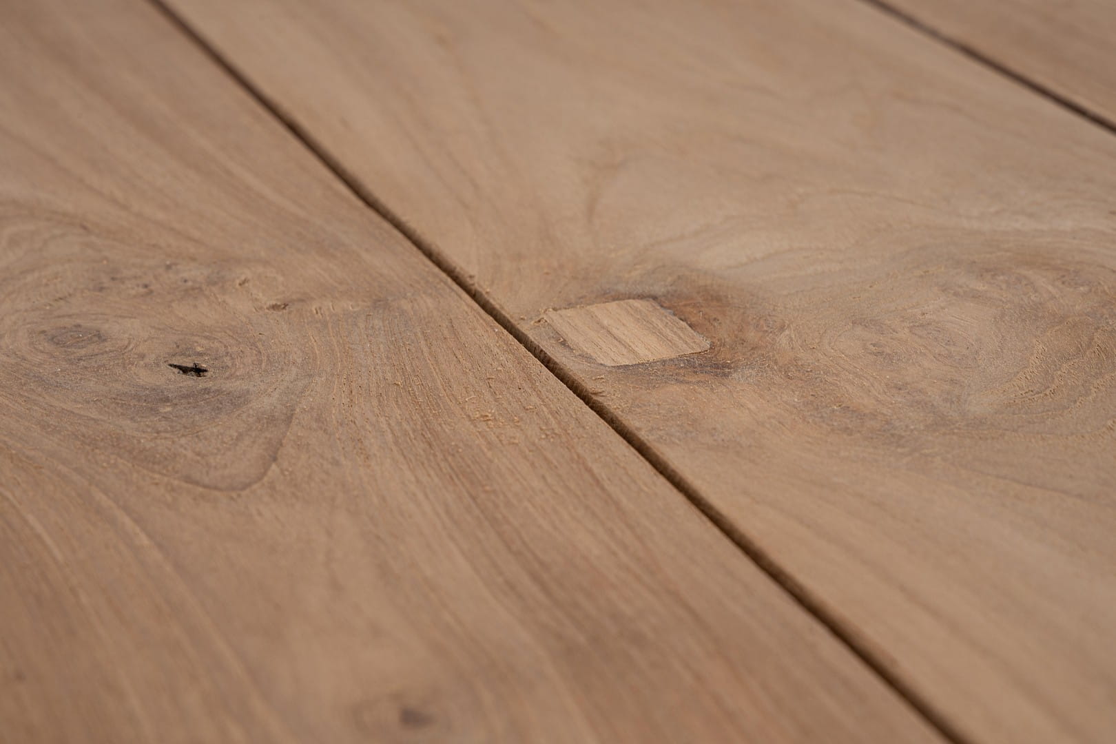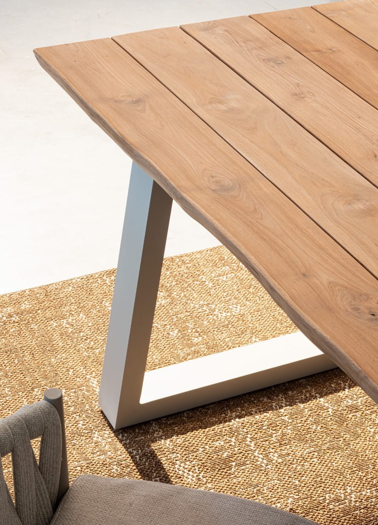 Stół ogrodowy Legend to propozycja dla miłośników szlachetnych materiałów i naturalnej estetyki. Blat wykonany z oryginalnych sekcji pnia drewna tekowego z certyfikatem SVLK zachwyca niepowtarzalnym rysunkiem słojów i subtelnym, naturalnym wykończeniem. Charakterystyczne dla tego modelu są widoczne drewniane kołki oraz mikrospękania, które mogą pojawiać się z czasem i świadczą o autentyczności materiału – każdy egzemplarz to unikat.