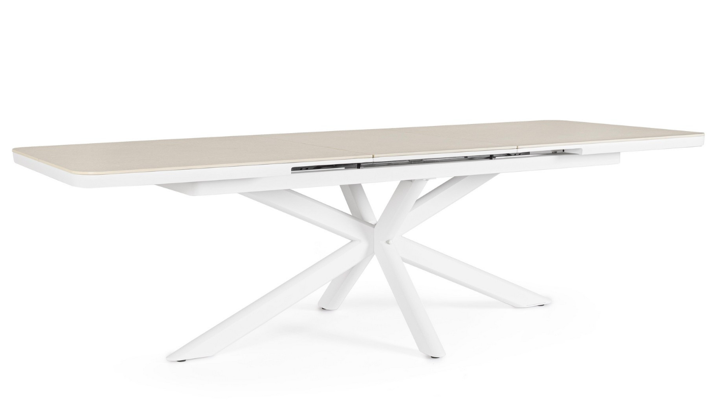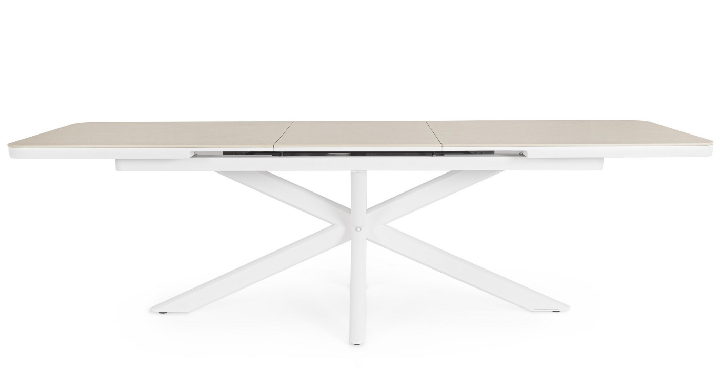 Rozkładany stół ogrodowy Pascal White to propozycja dla miłośników nowoczesnego minimalizmu i bezkompromisowej jakości. Mebel ten zachwyca architektoniczną formą podstawy – krzyżujące się aluminiowe nogi malowane proszkowo na kolor biały nadają mu lekkości i stabilności, tworząc efektowną rzeźbę w przestrzeni tarasu.