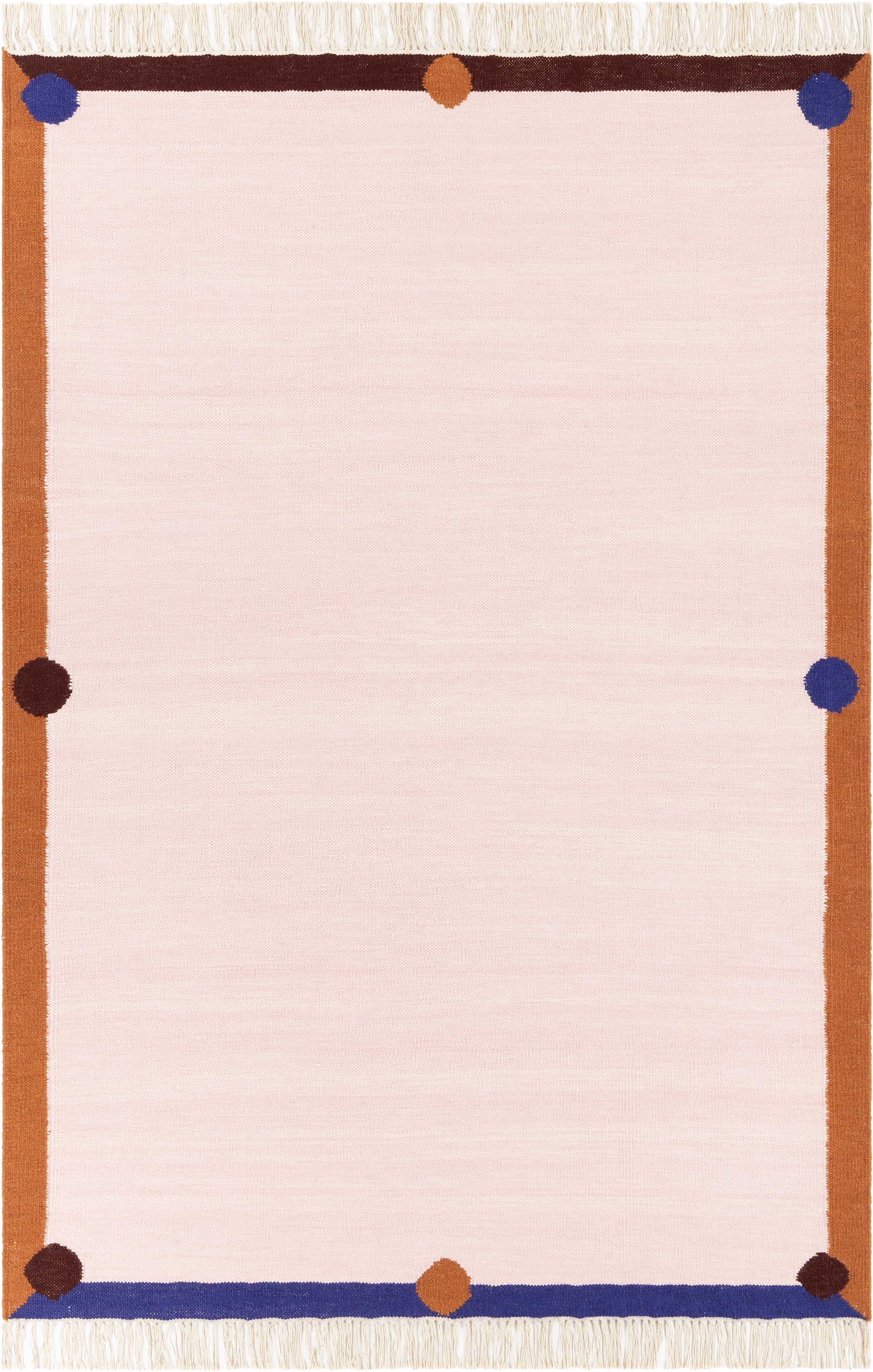 Model Berlin Kilim Candy z kolekcji Malwiny Konopackiej to lekka, graficzna interpretacja klasycznego motywu ramy w radosnej, „cukierkowej” odsłonie. Minimalistyczne, jasne pole środka zostało otoczone wyrazistą obwódką w odcieniach terakoty i granatu, a kolorowe, okrągłe akcenty rozmieszczone na krawędziach nadają kompozycji rytm i subtelną zabawę formą. Całość łączy w sobie nowoczesną prostotę z ciepłem naturalnych barw.
