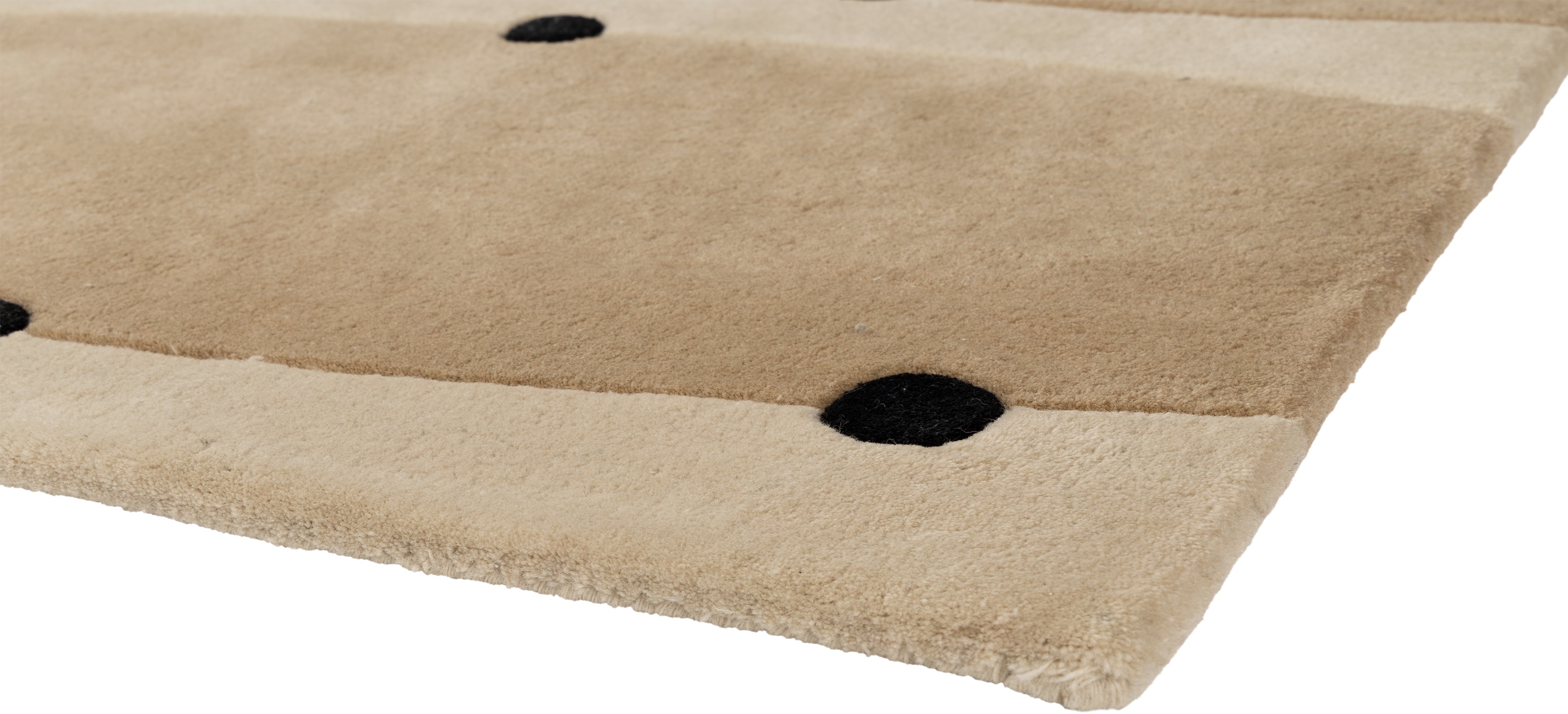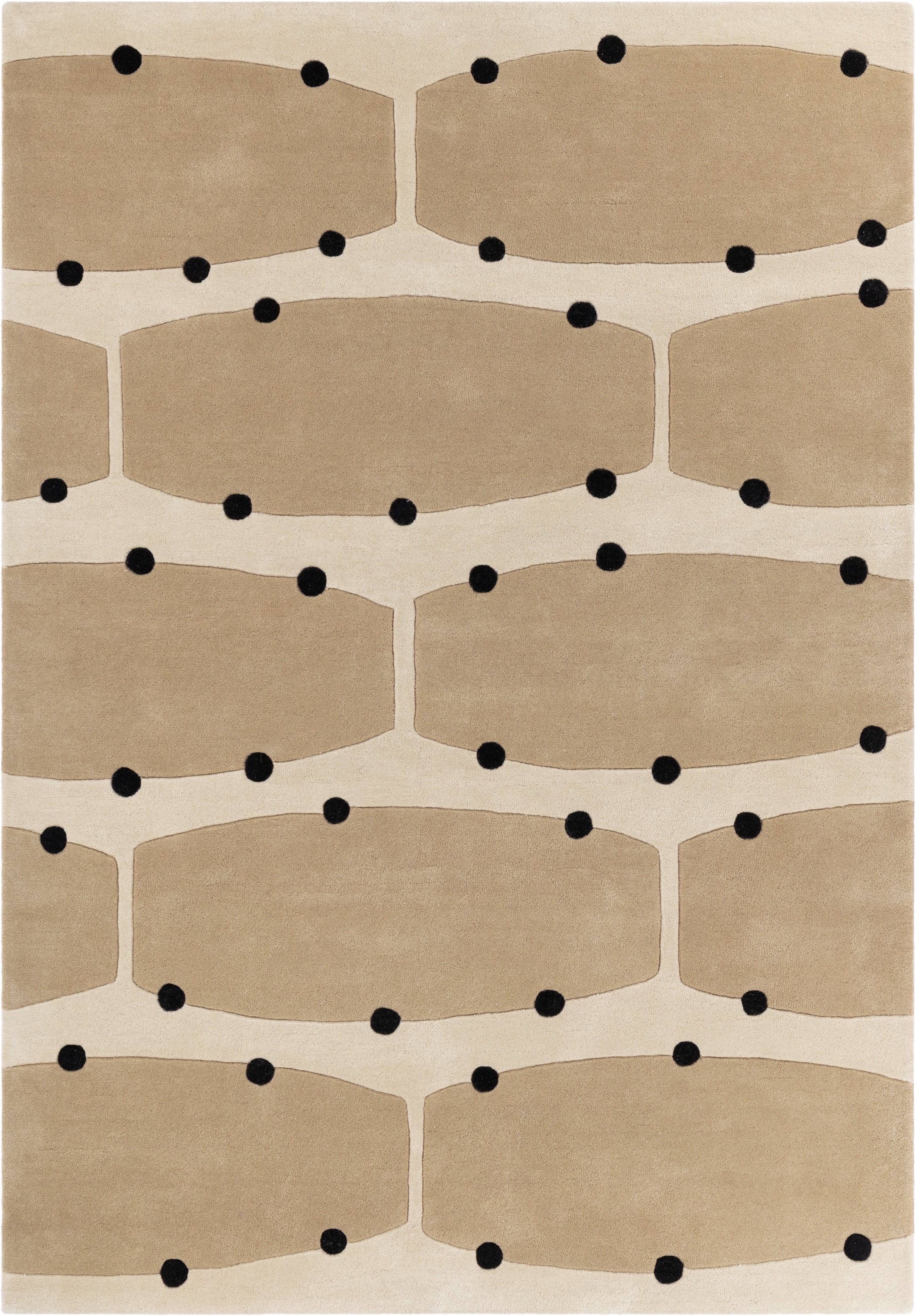 Model Rio z kolekcji Malwiny Konopackiej to rytm, powtarzalność i gra kontrastów zamknięte w miękkiej, wełnianej formie. Charakterystyczny, modułowy wzór przypominający organiczną siatkę zbudowany jest z zaokrąglonych pól i drobnych, wypukłych punktów, które nadają powierzchni subtelnej struktury i trójwymiarowości. Kompozycja jest wyrazista, a jednocześnie harmonijna – porządkuje przestrzeń i wprowadza do wnętrza spokojną dynamikę.