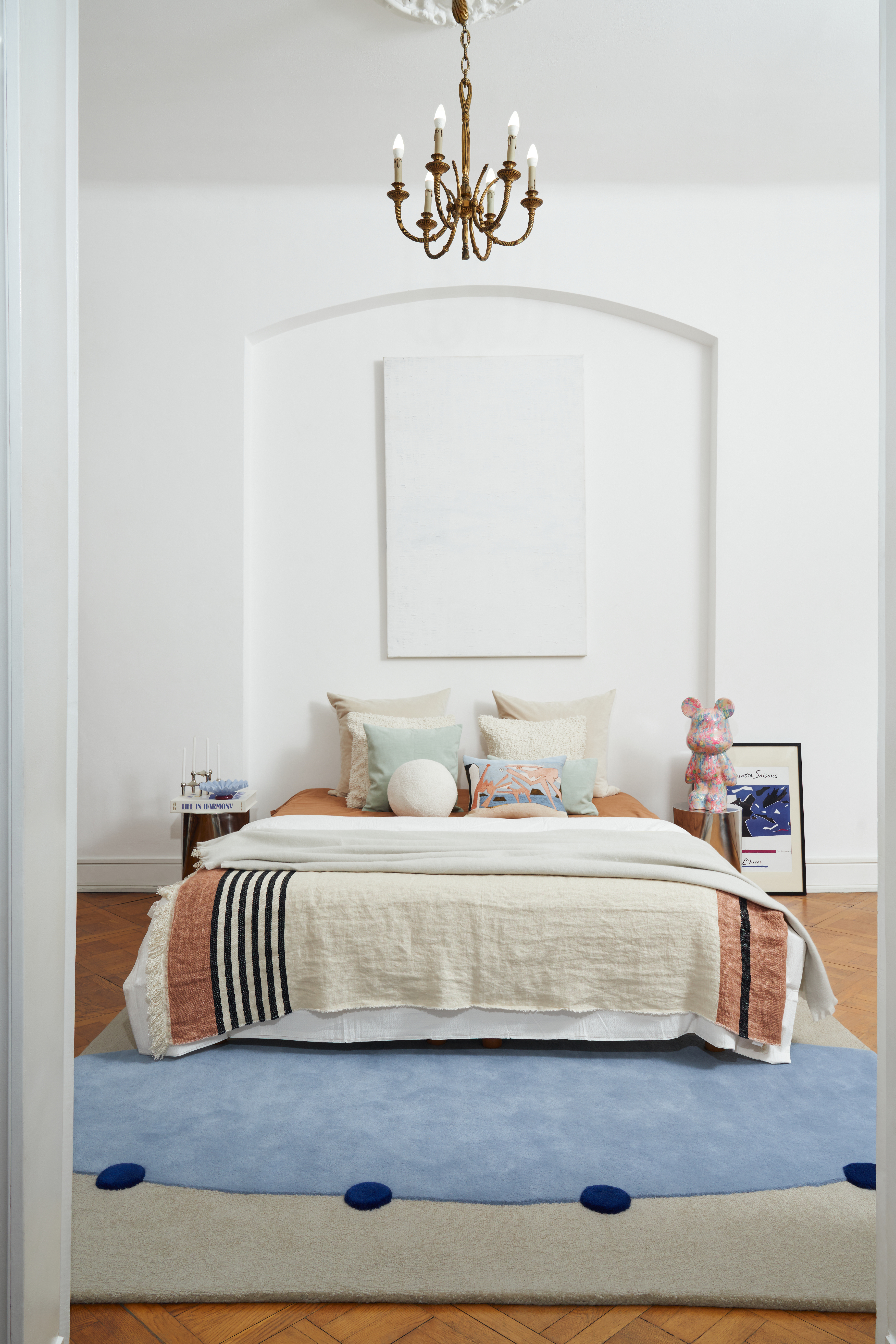 Model Rome z kolekcji Malwiny Konopackiej to wyważona, rzeźbiarska forma oparta na miękkim, centralnym kształcie otoczonym subtelnym tłem. Owalna kompozycja podkreślona jest rytmicznie rozmieszczonymi, wypukłymi punktami, które nadają projektowi lekkości i graficznej wyrazistości. Minimalistyczny układ i dopracowane proporcje sprawiają, że dywan wprowadza do wnętrza spokój, a jednocześnie staje się jego charakterystycznym akcentem.
