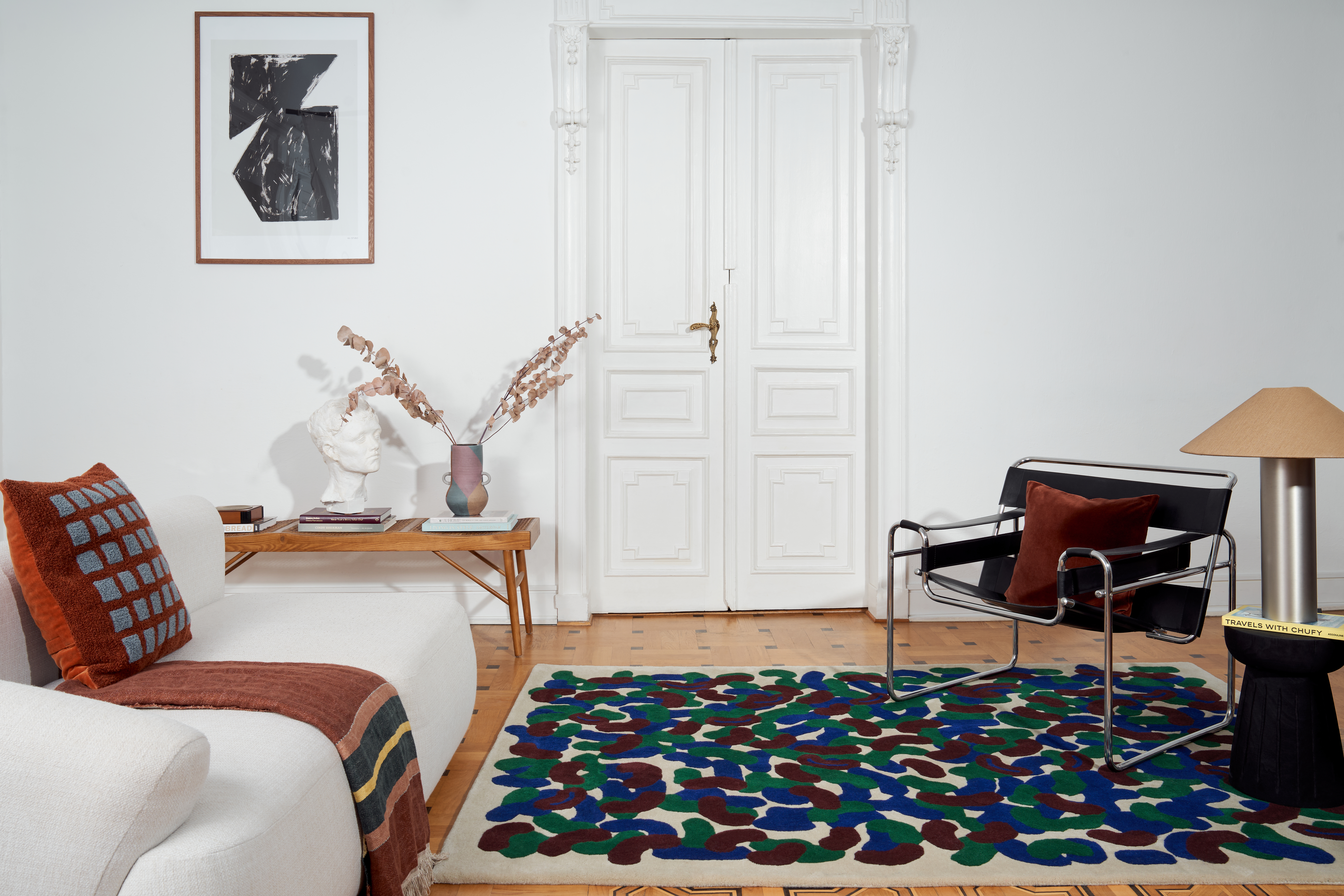 Model Tokyo z kolekcji Malwiny Konopackiej to dynamiczna, abstrakcyjna kompozycja inspirowana rytmem miasta i energią koloru. Nieregularne, organiczne formy w intensywnych odcieniach granatu, zieleni i głębokiego bordo tworzą gęsty, pulsujący wzór, który przyciąga wzrok i nadaje wnętrzu wyrazisty charakter. Projekt łączy artystyczną swobodę z graficzną dyscypliną, dzięki czemu dywan doskonale odnajduje się zarówno w nowoczesnych, jak i bardziej eklektycznych przestrzeniach.
