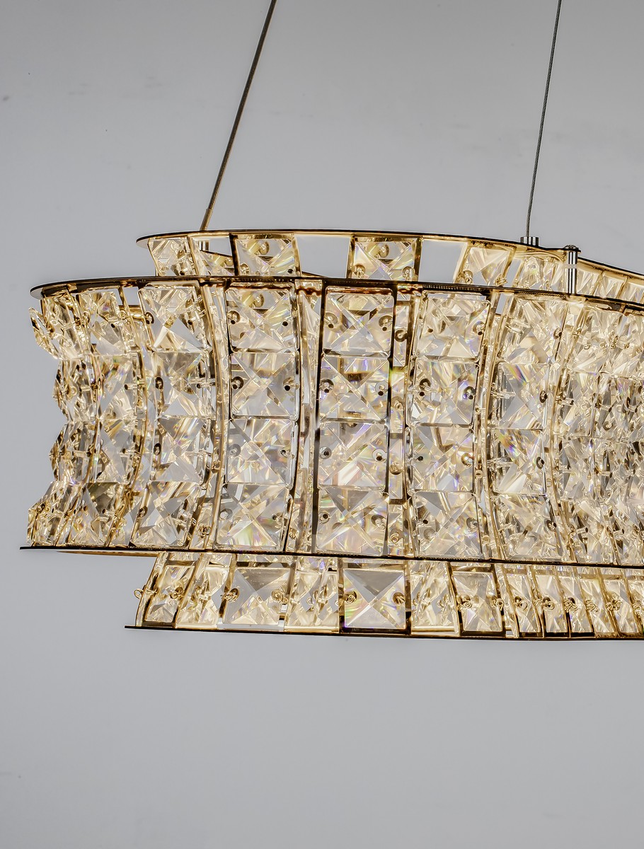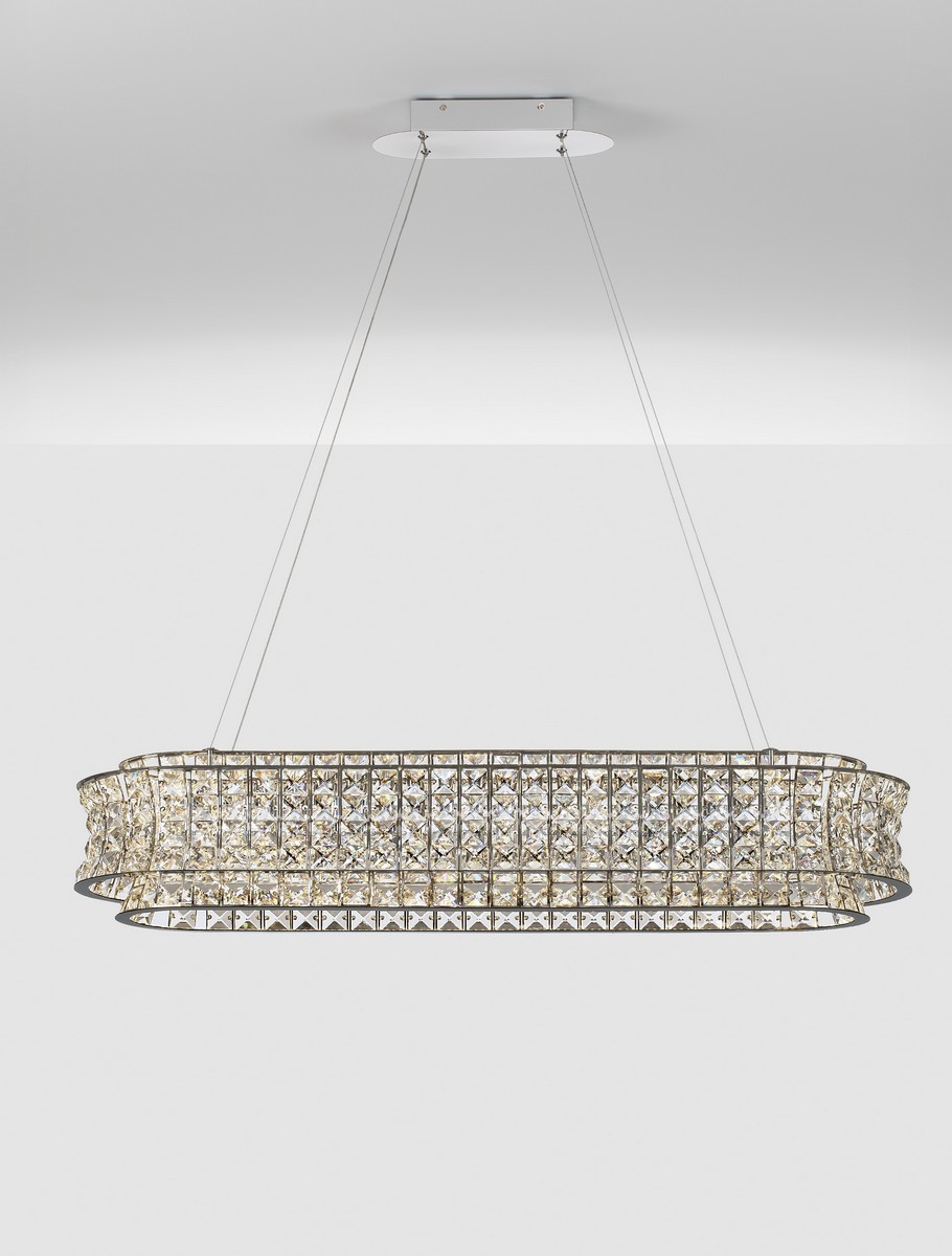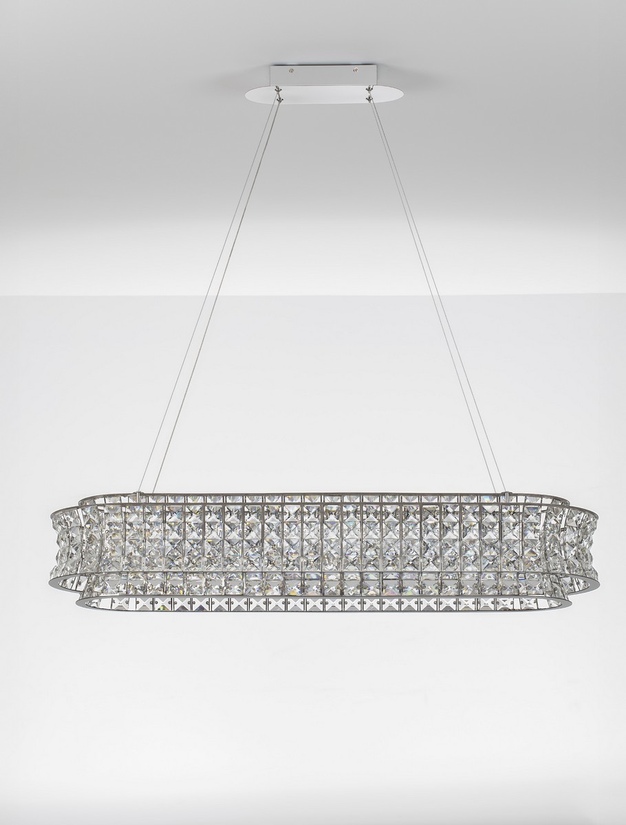 Lampa wisząca Arona od marki Nova Luce to zjawiskowy element oświetleniowy, który w mistrzowski sposób łączy nowoczesny design z klasycznym, kryształowym szykiem. W tym imponującym, owalnym wariancie o długości 100 cm i głębokości 30 cm, oprawa robi niesamowite wrażenie. Wykonana z polerowanej na wysoki połysk, chromowanej stali nierdzewnej oraz transparentnych kryształów, przyciąga wzrok swoją bogatą, wielopoziomową budową. Misternie oszlifowane detale wspaniale załamują światło, dodając wnętrzu luksusowego i prestiżowego charakteru w stylu glamour.