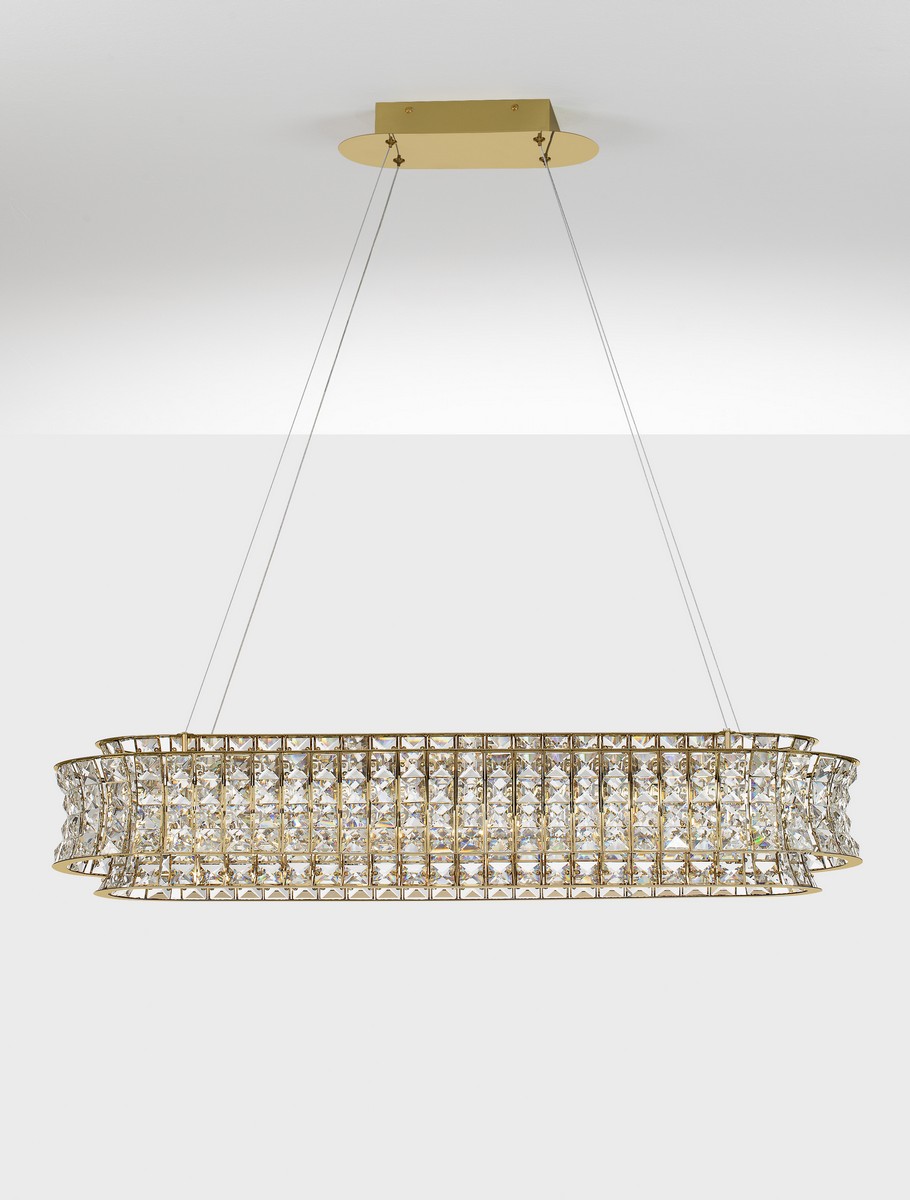 Lampa wisząca Arona od marki Nova Luce to zjawiskowy element oświetleniowy, który w mistrzowski sposób łączy nowoczesny design z luksusowym, kryształowym szykiem. W tym imponującym, owalnym wariancie o długości 100 cm, oprawa robi niesamowite wrażenie. Wykonana z wysokiej jakości stali nierdzewnej w szlachetnym, złotym wykończeniu oraz transparentnych kryształów, przyciąga wzrok swoją bogatą, wielopoziomową budową. Misternie oszlifowane detale wspaniale załamują światło, dodając wnętrzu prestiżowego charakteru w stylu glamour.