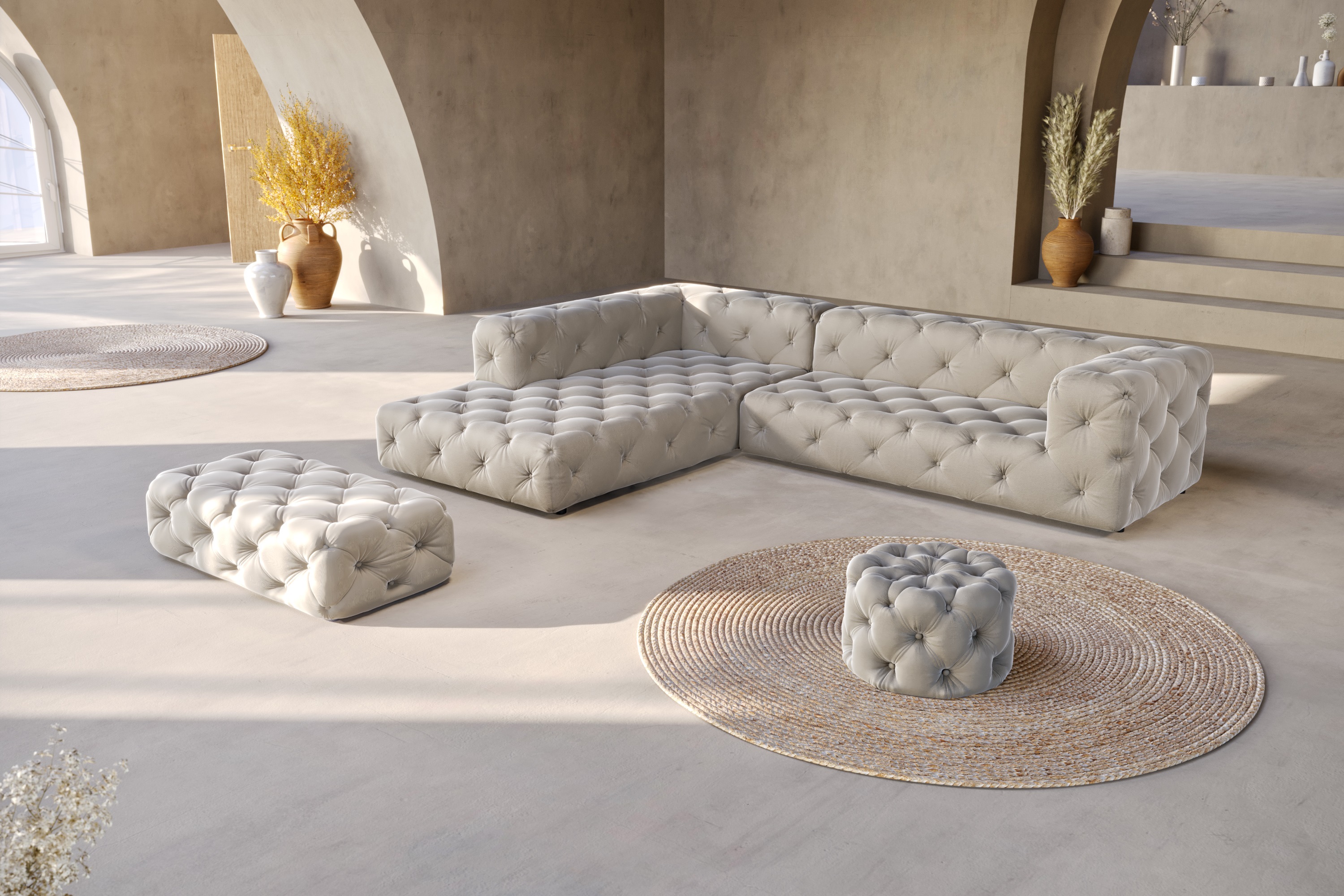 Sofa narożna Cos to połączenie luksusu, klasycznej elegancji i nowoczesnej, rzeźbiarskiej formy. Jej charakterystyczna bryła opiera się na pełnych, miękko zaoblonych kształtach, które tworzą harmonijną całość i przyciągają uwagę z każdej strony. To mebel, który nie jest jedynie elementem wyposażenia – staje się centralnym punktem wnętrza, wprowadzając do niego atmosferę przytulnego salonu butikowego lub apartamentu w stylu glamour.