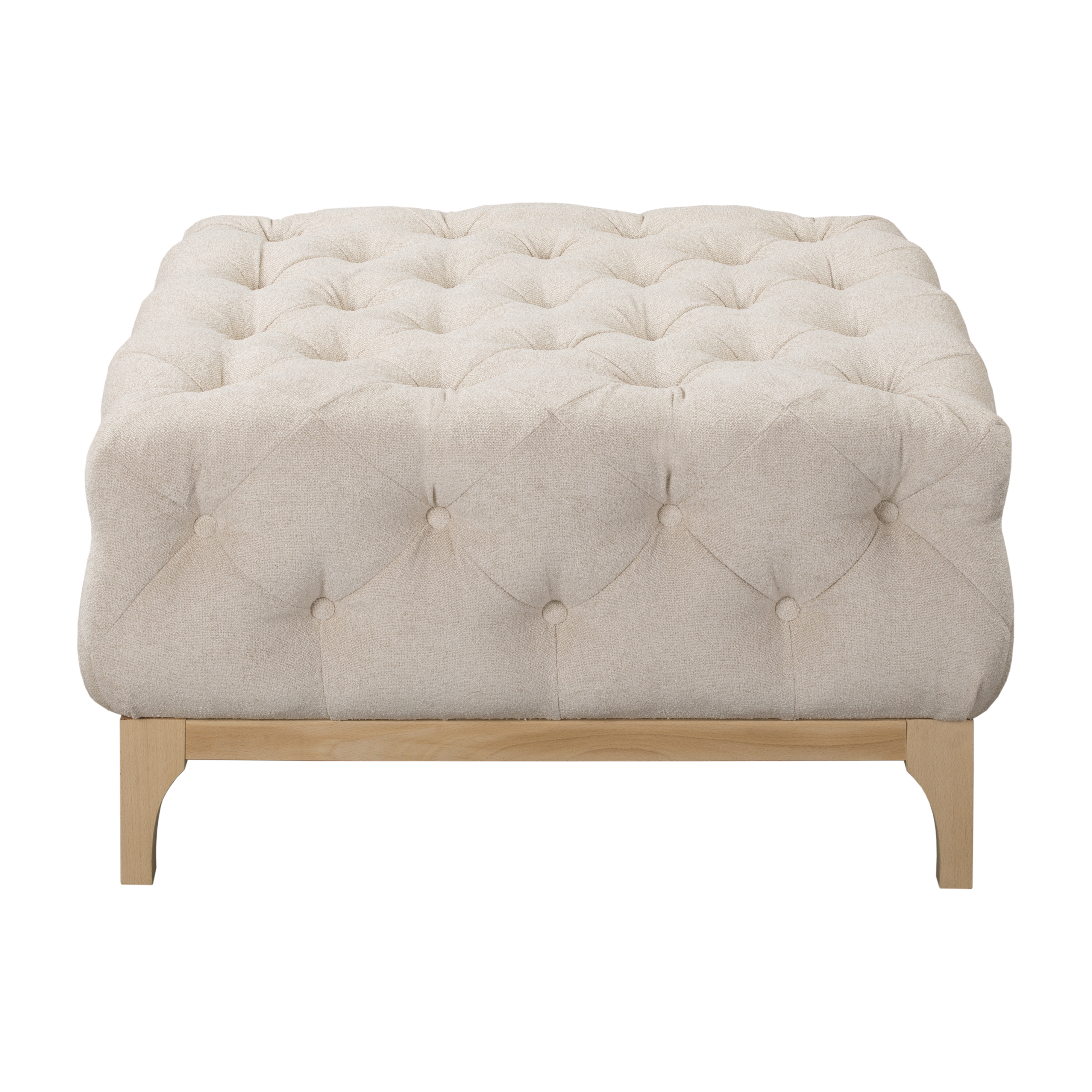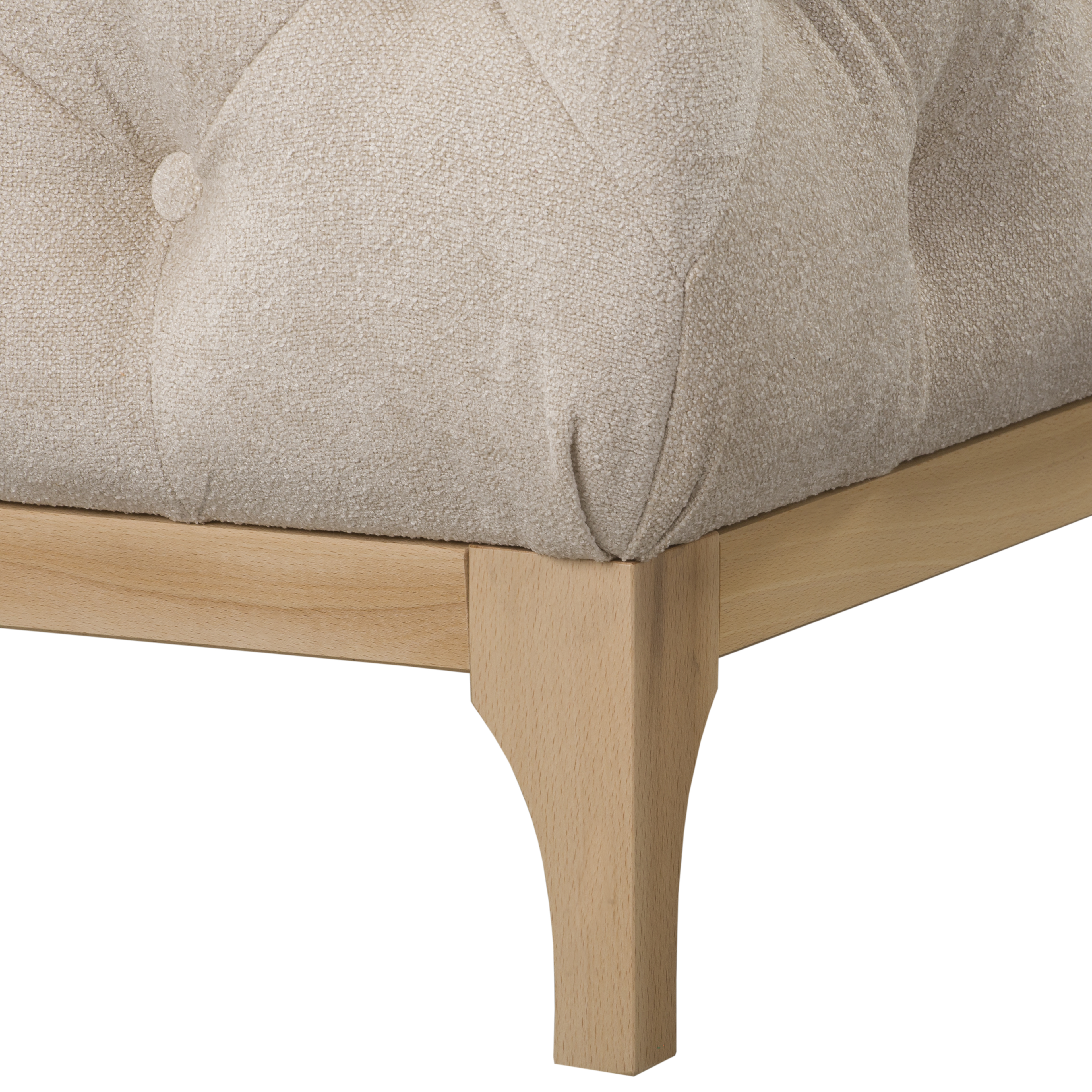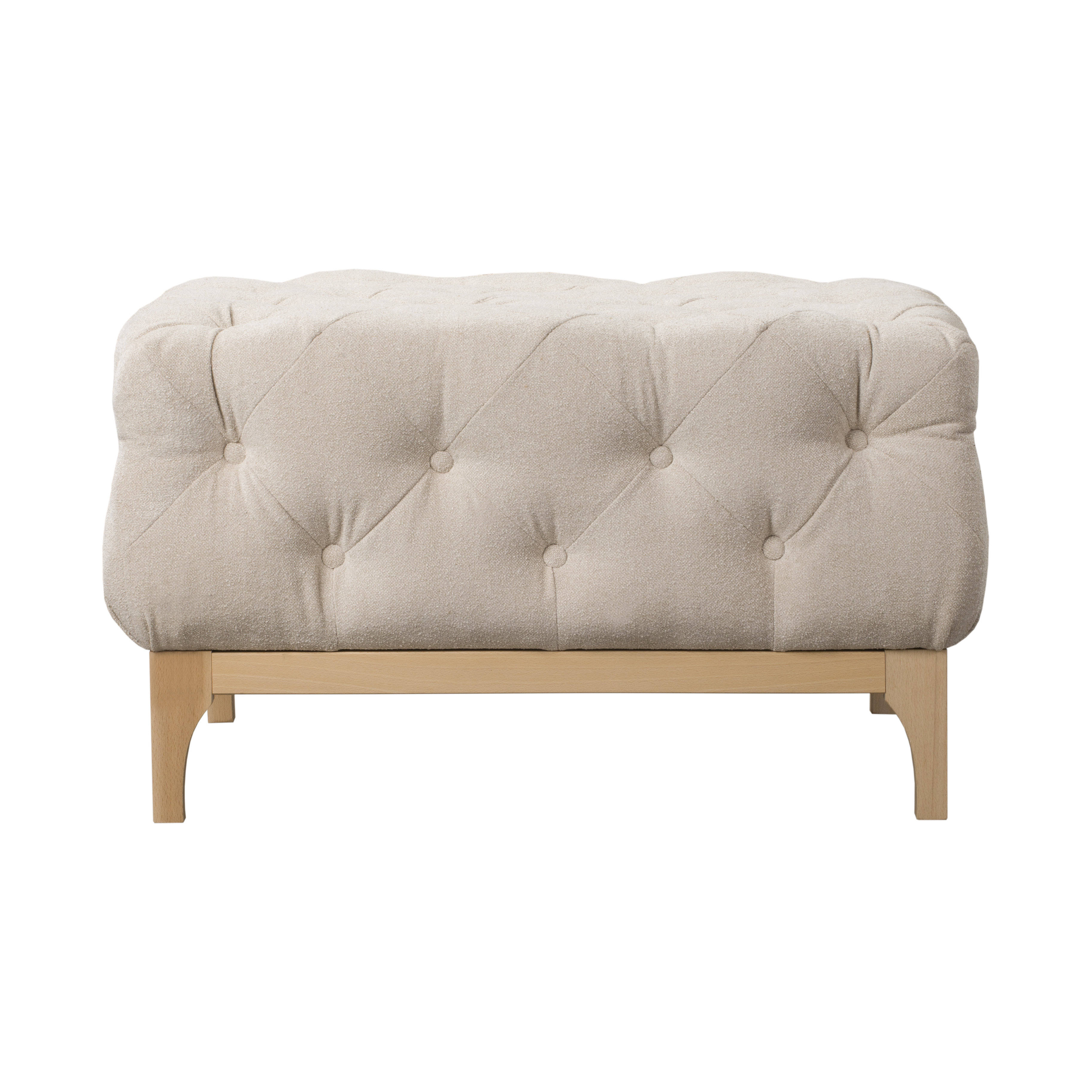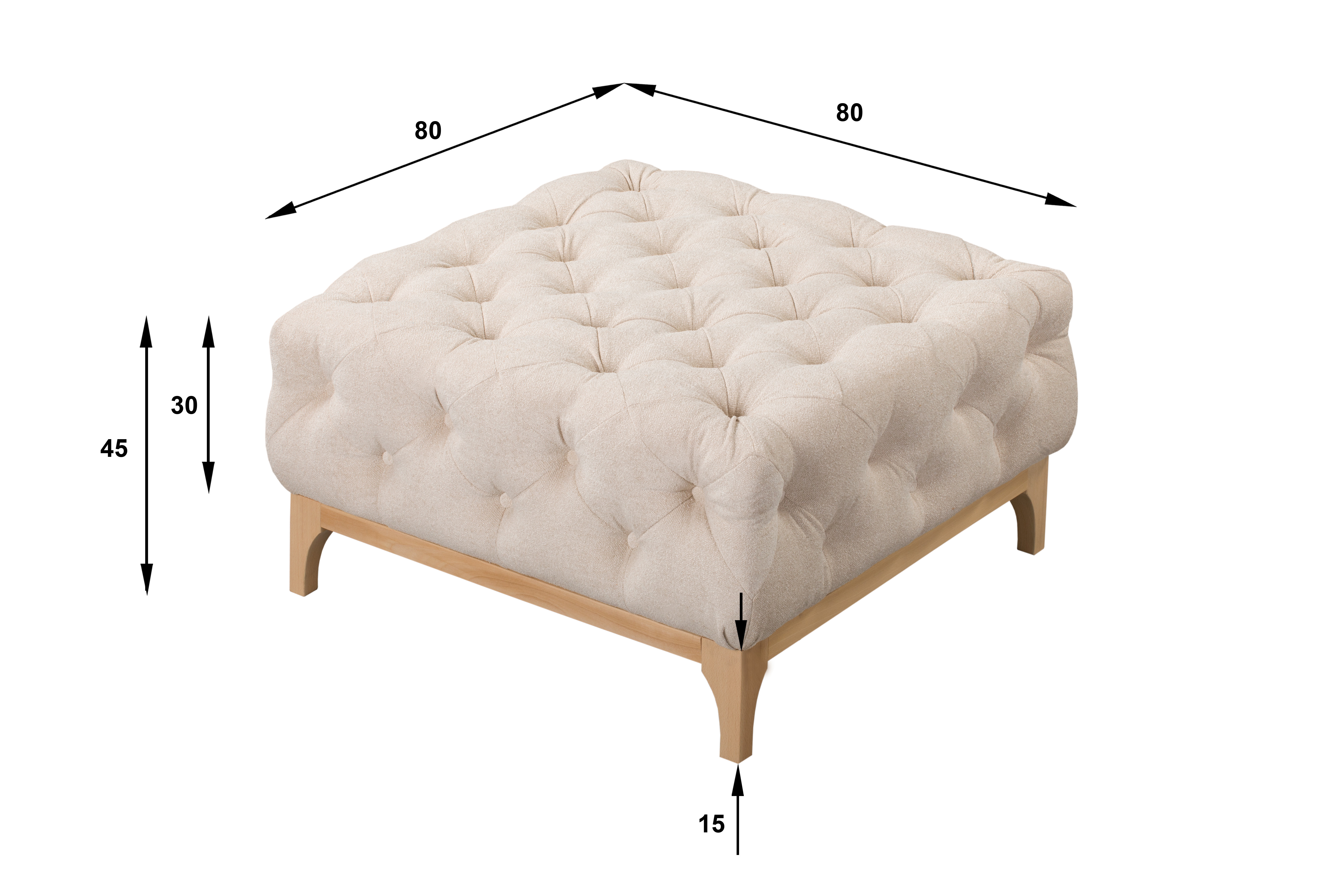 Pufa umieszczona jest na stabilnych, drewnianych nóżkach o wysokości 15 cm, co dodaje jej eleganckiego charakteru.