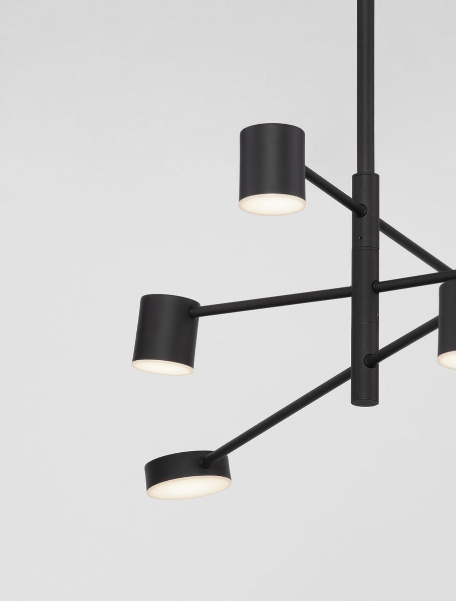 Lampa wisząca Abel-6 w całości wykonana została z aluminium w czarnym kolorze o matowym wykończeniu. Okrągła podsufitka utrzymuje pionowy, metalowy pręt z sześcioma rozgałęzieniami w postaci metalowych rurek. Każda z sześciu rurek zakończona jest okrągłym kloszem, skrywającym źródło światła LED. Naprzemienne rozmieszczenie kloszy o różnych rozmiarach i średnicach daje ciekawy efekt asymetrii oraz pozwala na uzyskanie dekoracyjnych efektów świetlnych. Klosze wykończone zostały za pomocą akrylu o wysokiej trwałości. Lampa posiada możliwość ściemniania, za pomocą zewnętrznego ściemniacza.