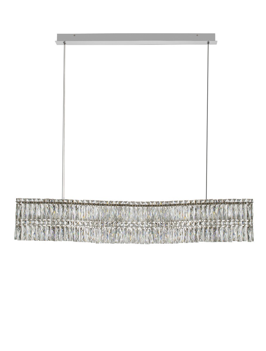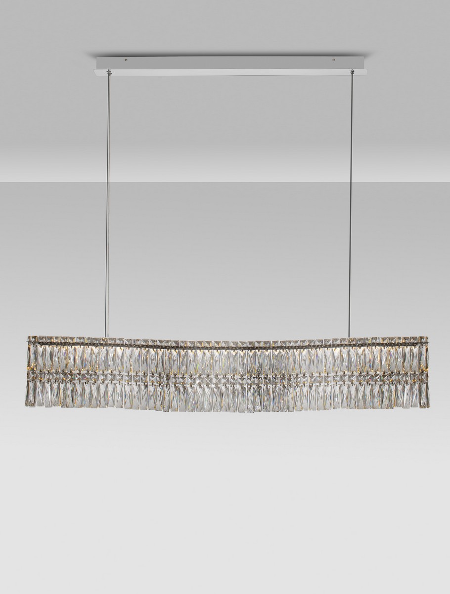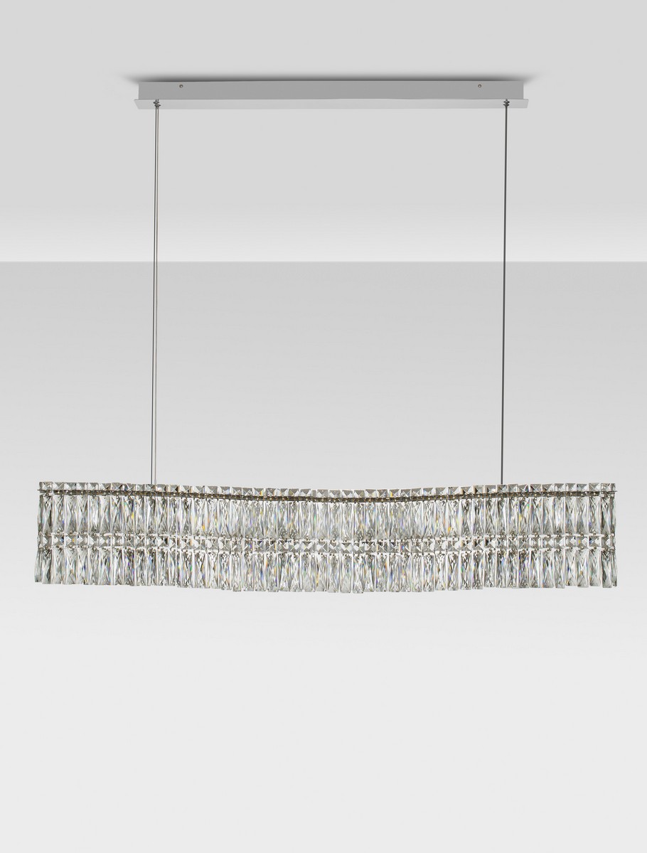 Lampa wisząca Ariza od marki Nova Luce to spektakularna, podłużna oprawa o imponującej długości 120 cm. Jej innowacyjny design łączy współczesną, horyzontalną formę z ponadczasowym urokiem transparentnych kryształów. Konstrukcja z chromowanej stali nierdzewnej została zgrabnie pofalowana, co nadaje oprawie wizualnej lekkości i dynamiki. Równomiernie osadzone kryształy wspaniale załamują światło, wprowadzając do wnętrza luksusowy klimat w stylu glamour.