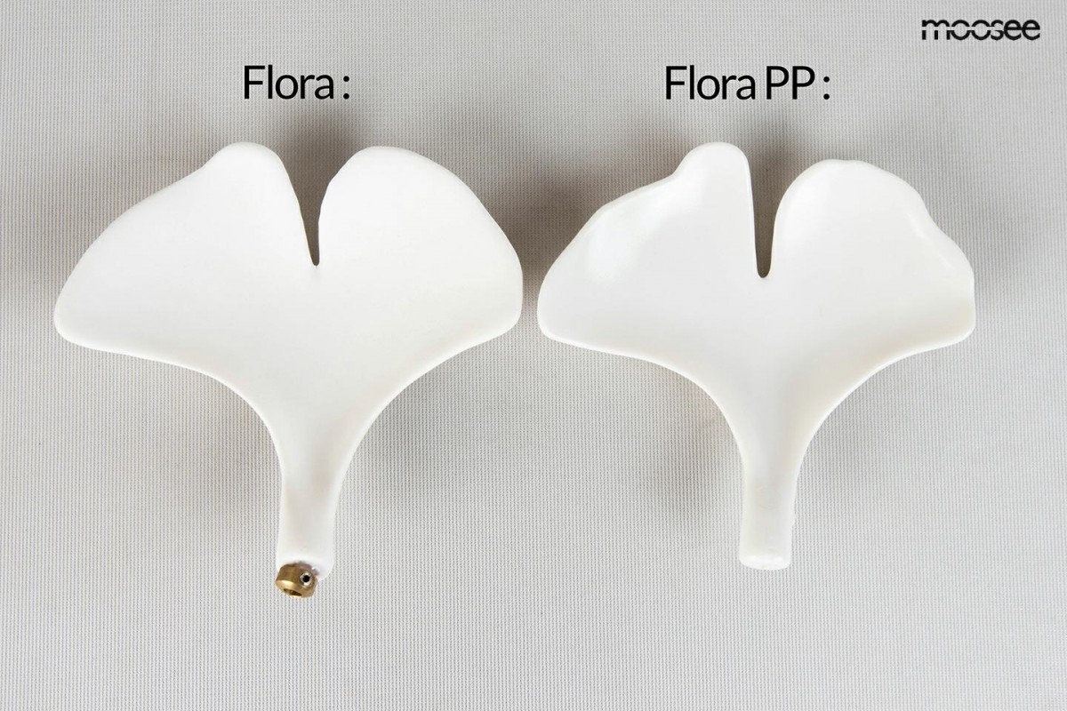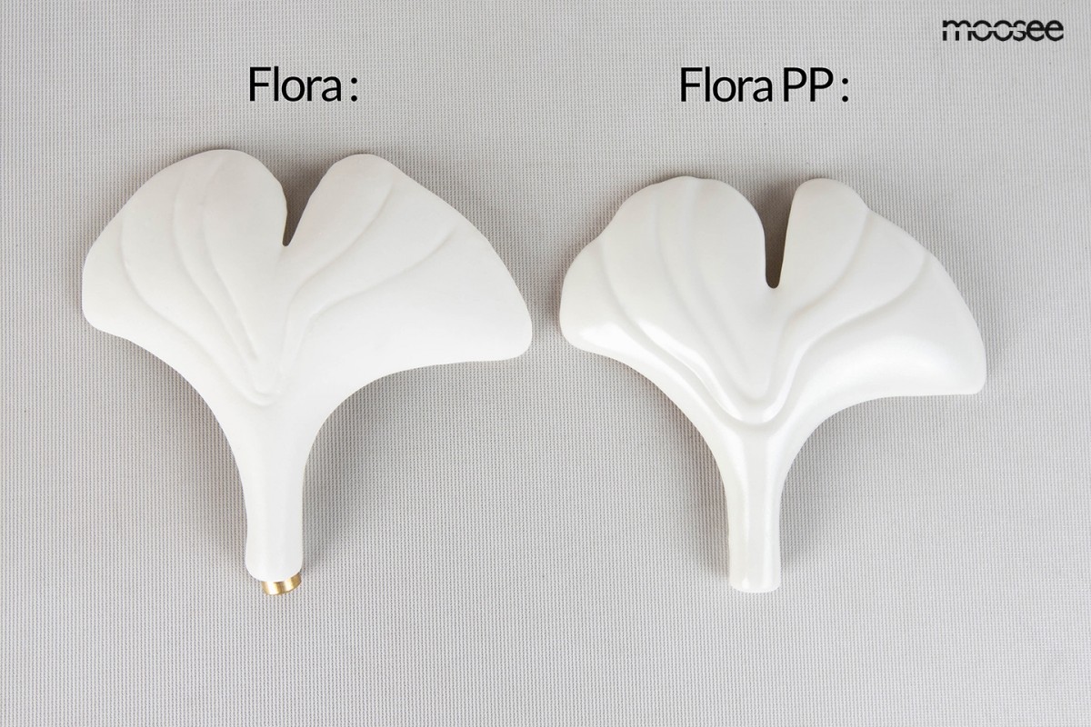 Głównym elementem dekoracyjnym są subtelne, ceramiczne klosze, których kształt łagodnie naśladuje płatki kwiatu. W zestawie znajdują się matowe, białe klosze, które umieszczono na eleganckim, złotym stelażu. Cała konstrukcja przywodzi na myśl delikatnie rozgałęzione gałązki, tworząc luksusowy i organiczny efekt wizualny. Złote wykończenie oprawy dodaje blasku i szyku, podczas gdy cała seria FLORA jest dostępna w różnych rozmiarach, co pozwala na spójne aranżacje.