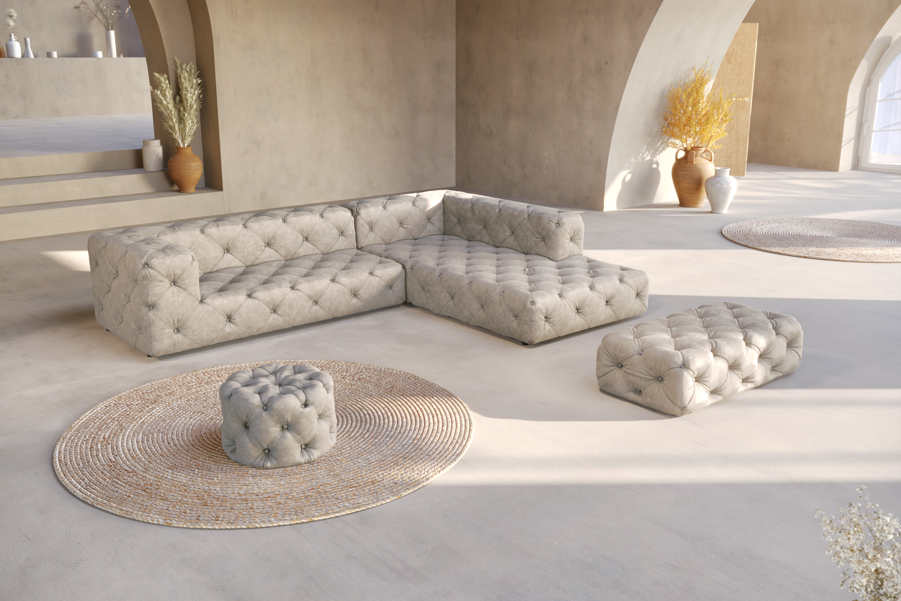 Pufa prostokątna Cos to wyjątkowy element kolekcji, który zachwyca luksusową bryłą i spektakularnym pikowaniem typu Chesterfield. Jej miękkie, harmonijnie zaoblone kształty oraz głębokie, ręcznie wykonane przeszycia tworzą efekt pełnej, puszystej struktury, dzięki czemu pufa staje się nie tylko praktycznym dodatkiem, ale także dekoracyjną rzeźbą we wnętrzu.
