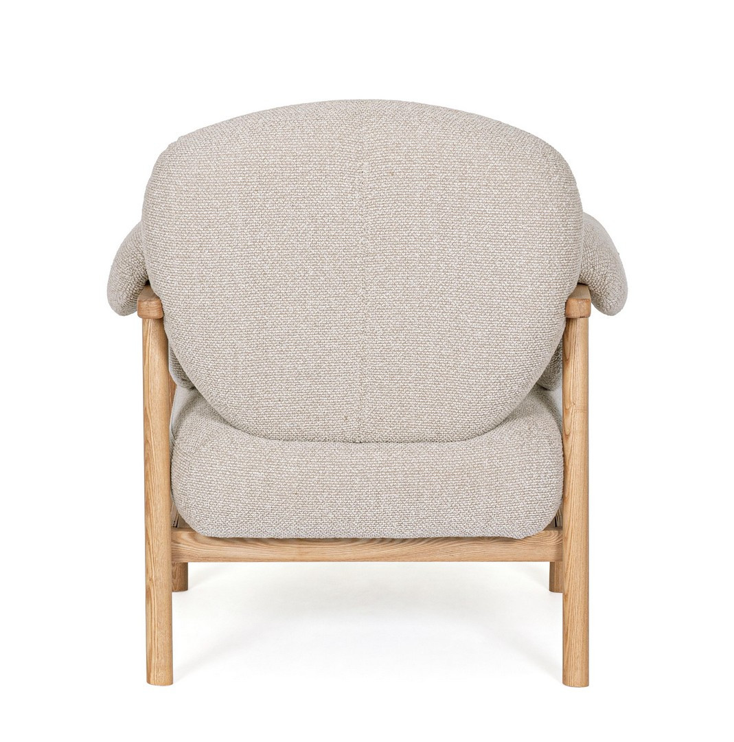 Fotel Calista to połączenie skandynawskiej estetyki z nowoczesnym komfortem. Charakteryzuje się miękkimi, organicznymi kształtami poduszek, które kontrastują z prostą, stabilną ramą wykonaną z jasnego drewna brzozowego. Szerokie, zaokrąglone siedzisko i oparcie są wypełnione wysokiej jakości pianką poliuretanową, zapewniającą doskonałe podparcie i głęboki relaks. Mebel tapicerowany jest trwałą tkaniną poliestrową o ciekawej, teksturowanej strukturze w neutralnym kolorze, co dodaje mu przytulności i elegancji.