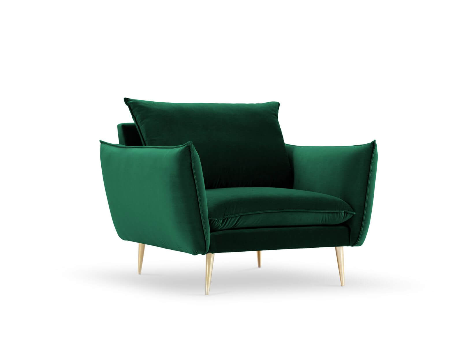 Wygodny fotel w kolorze butelkowej zieleni na złotych nóżkach to trafny wybór do wnętrz w stylu nowoczesnym, ale też urban jungle czy glamour. Świetnie zaprezentuje się w towarzystwie innych mebli z kolekcji Elio, ale także jako samodzielny element wystroju.