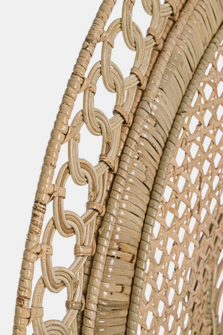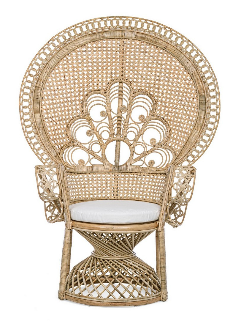 Fotel Peacock to prawdziwa ikona stylu boho i vintage, czerpiąca inspirację z tropikalnej estetyki. Jego imponujące, wysokie oparcie (148 cm) w kształcie pawiego ogona, wykonane z naturalnego rattanu i wikliny, tworzy spektakularny, rzeźbiarski efekt. Staranne, ręczne plecionki tworzą ażurowy wzór z centralnym motywem pióra, który nadaje meblowi lekkości i romantycznego uroku. W zestawie znajduje się wygodna, wyjmowana poduszka na siedzisko, która zapewnia komfortowy wypoczynek.
