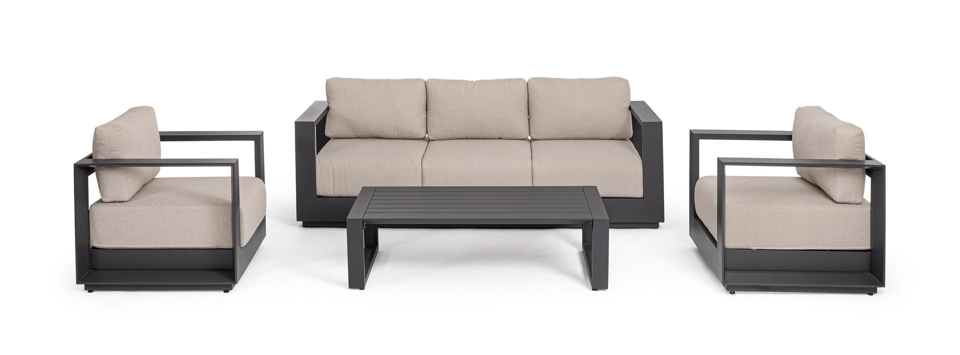 Zestaw ogrodowy Moses to nowoczesna i elegancka propozycja dla osób, które cenią geometryczne formy, minimalizm i funkcjonalność. Dostępny w dwóch wariantach kolorystycznych — subtelnym beżu oraz głębokim antracycie — doskonale wpisuje się zarówno w przestrzenie tarasowe, jak i nowoczesne ogrody czy patio.