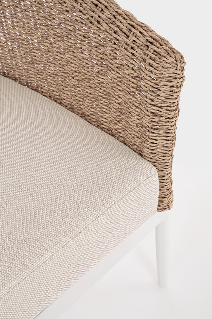 Oparcia i boki mebli pokryte są ręcznie plecionym, trwałym włóknem syntetycznym o okrągłym przekroju 3,5 mm, które przywodzi na myśl klasyczne techniki rzemieślnicze, zachowując przy tym współczesną estetykę. Konstrukcja z malowanego proszkowo aluminium nadaje lekkości i odporności na warunki atmosferyczne, a zdejmowane poduszki z tkaniny Olefin są przyjemne w dotyku, wodoodporne i łatwe do utrzymania w czystości.